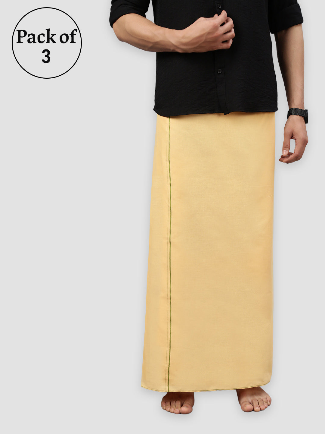 Crafted from 100% cotton, this single-layer dhoti offers a perfect blend of comfort and tradition. Its breathable and lightweight fabric ensures ease of movement, making it ideal for extended wear during festive or ceremonial occasions. The subtle small border adds a refined touch, enhancing its classic and elegant appeal. Whether paired with a kurta or traditional shirt, this dhoti is a timeless choice for poojas, weddings, and cultural celebrations.