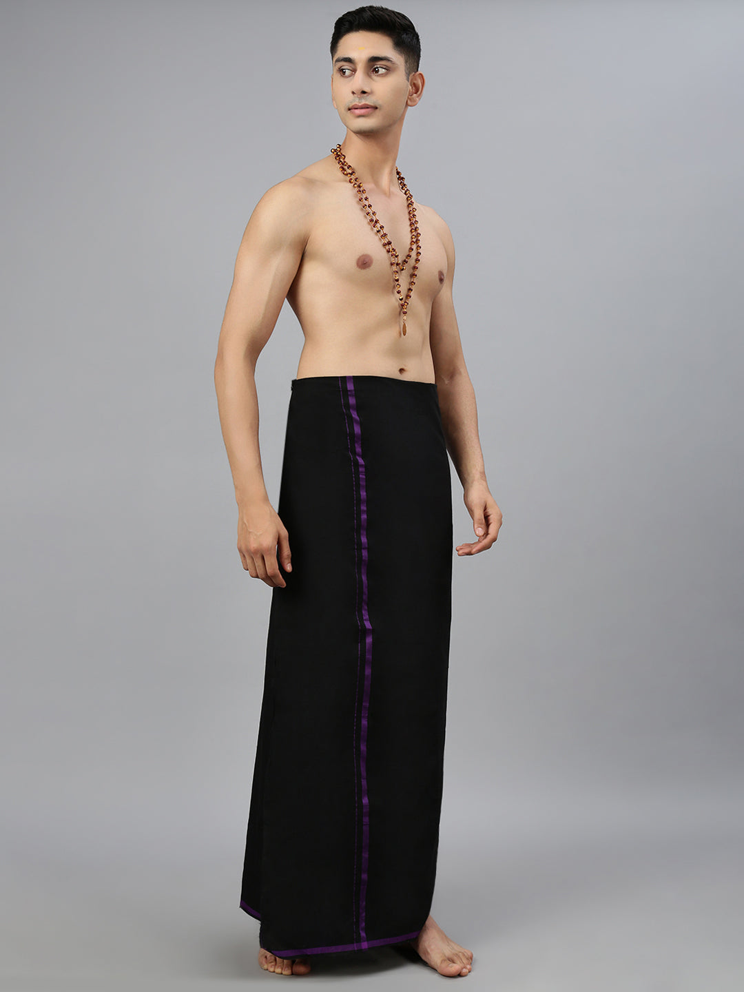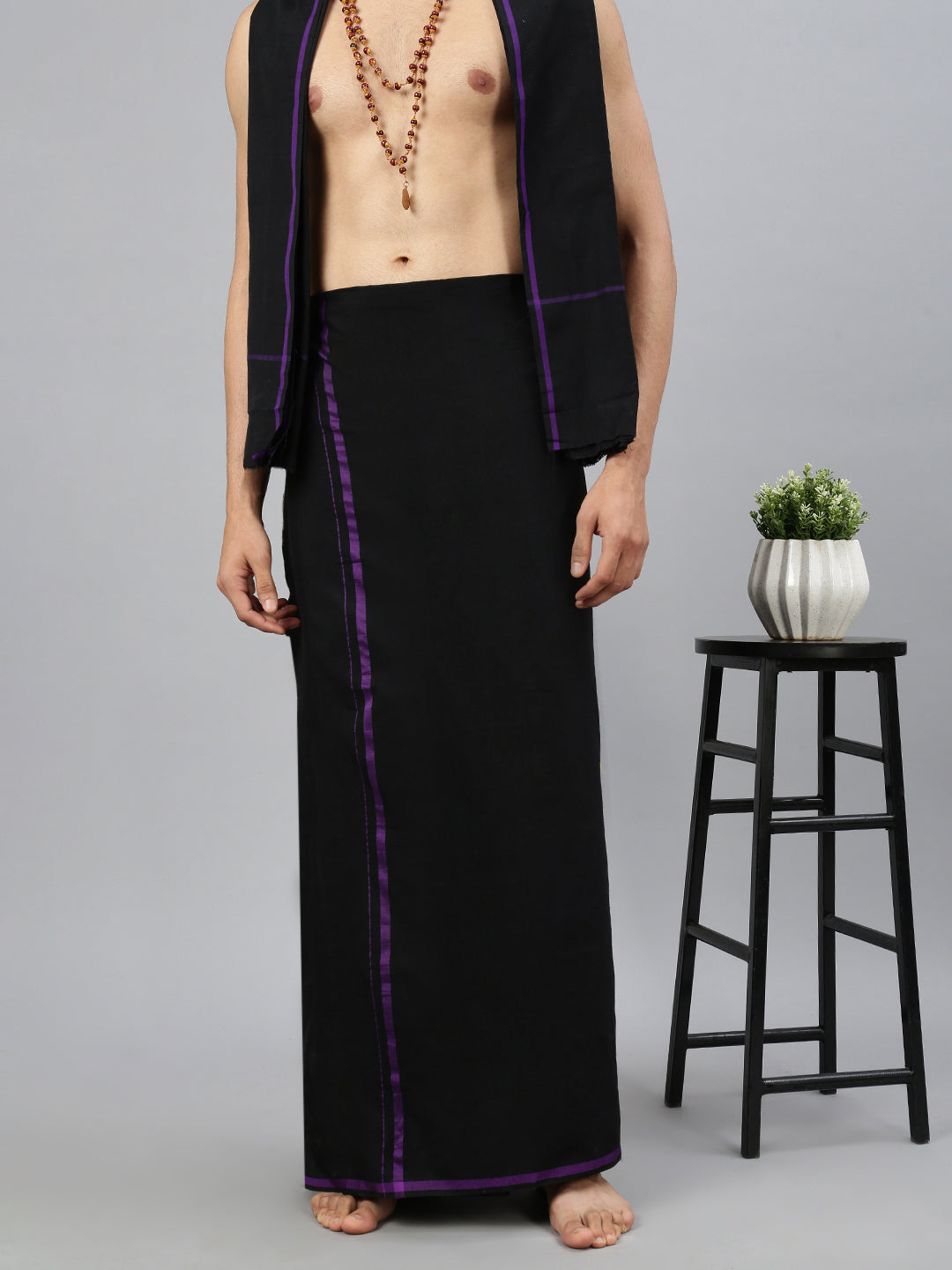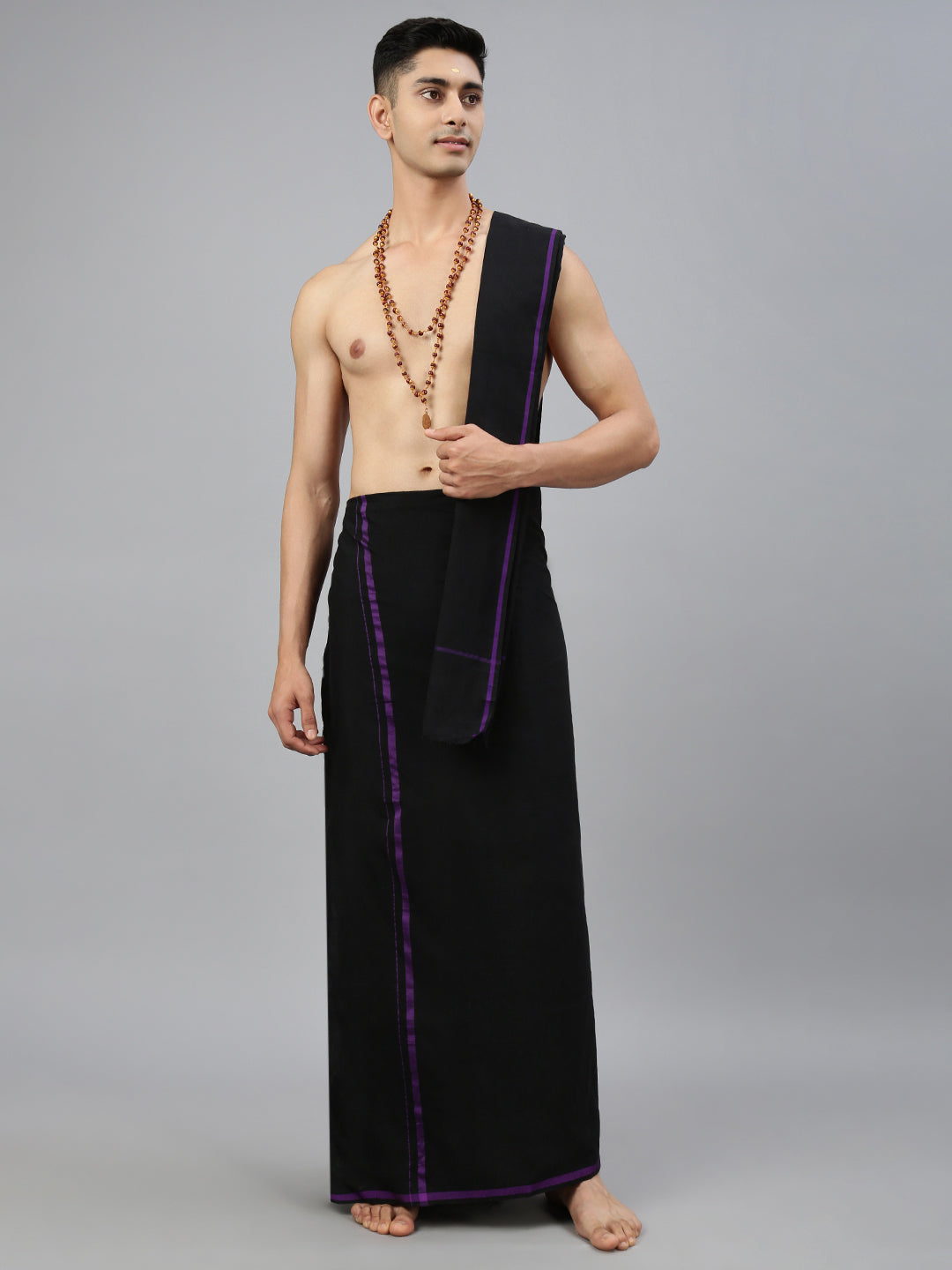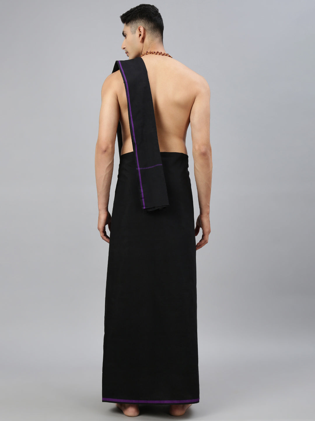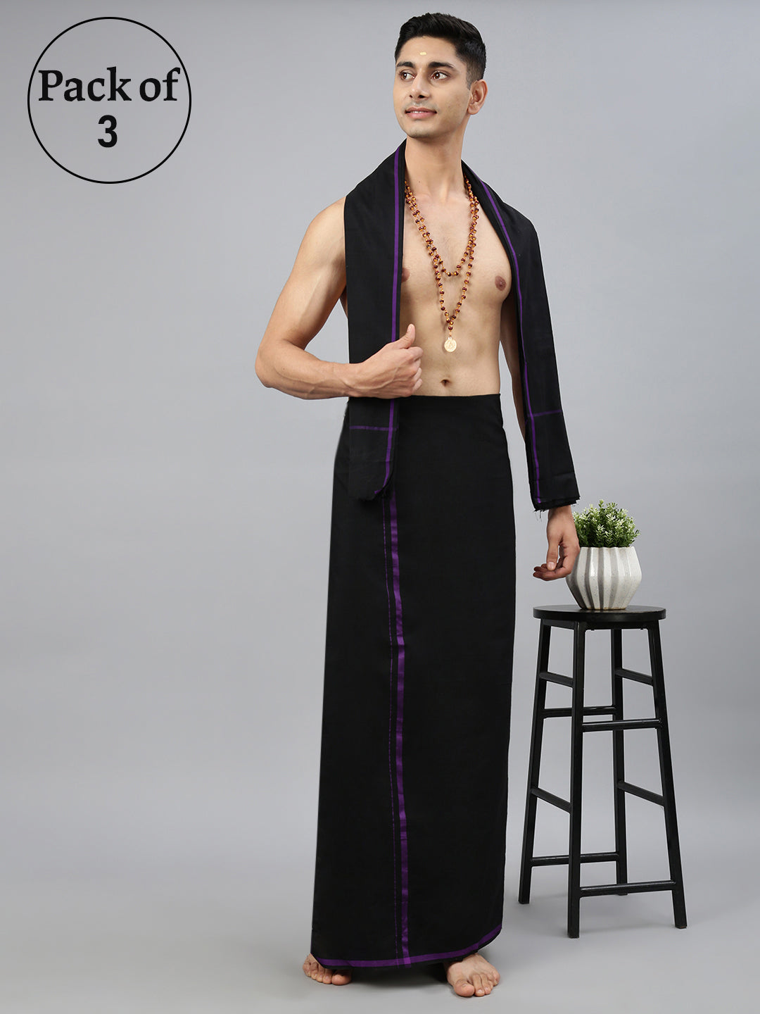 Men Cotton Blend Single Layer Black Dhoti & Towel Set Manikanda Pack of 3