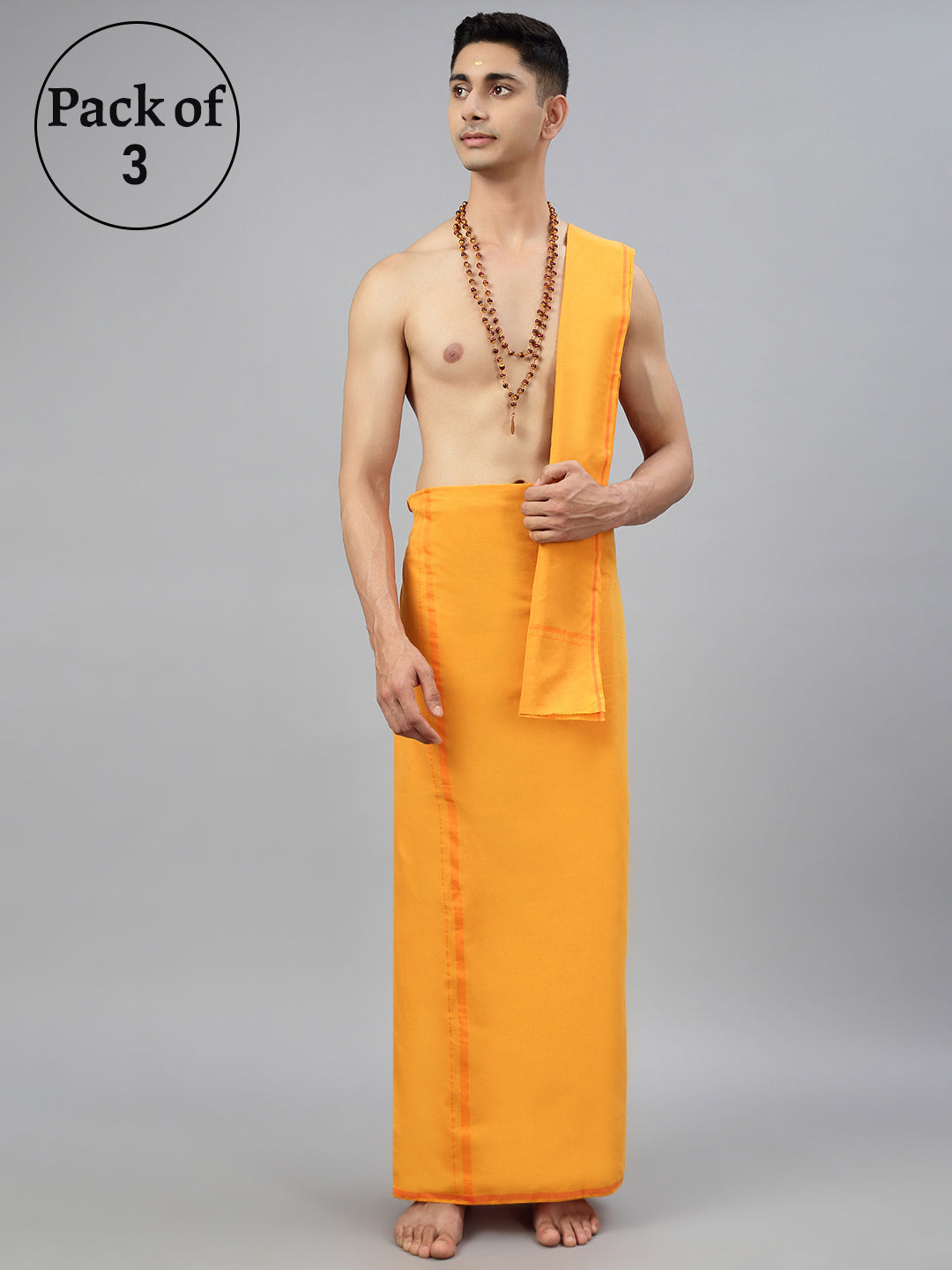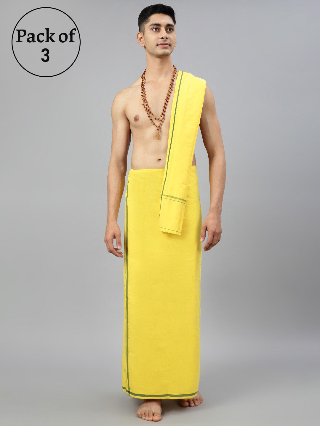 Men Cotton Blend Single Layer Yellow Dhoti & Towel Set Manikanda Pack of 3