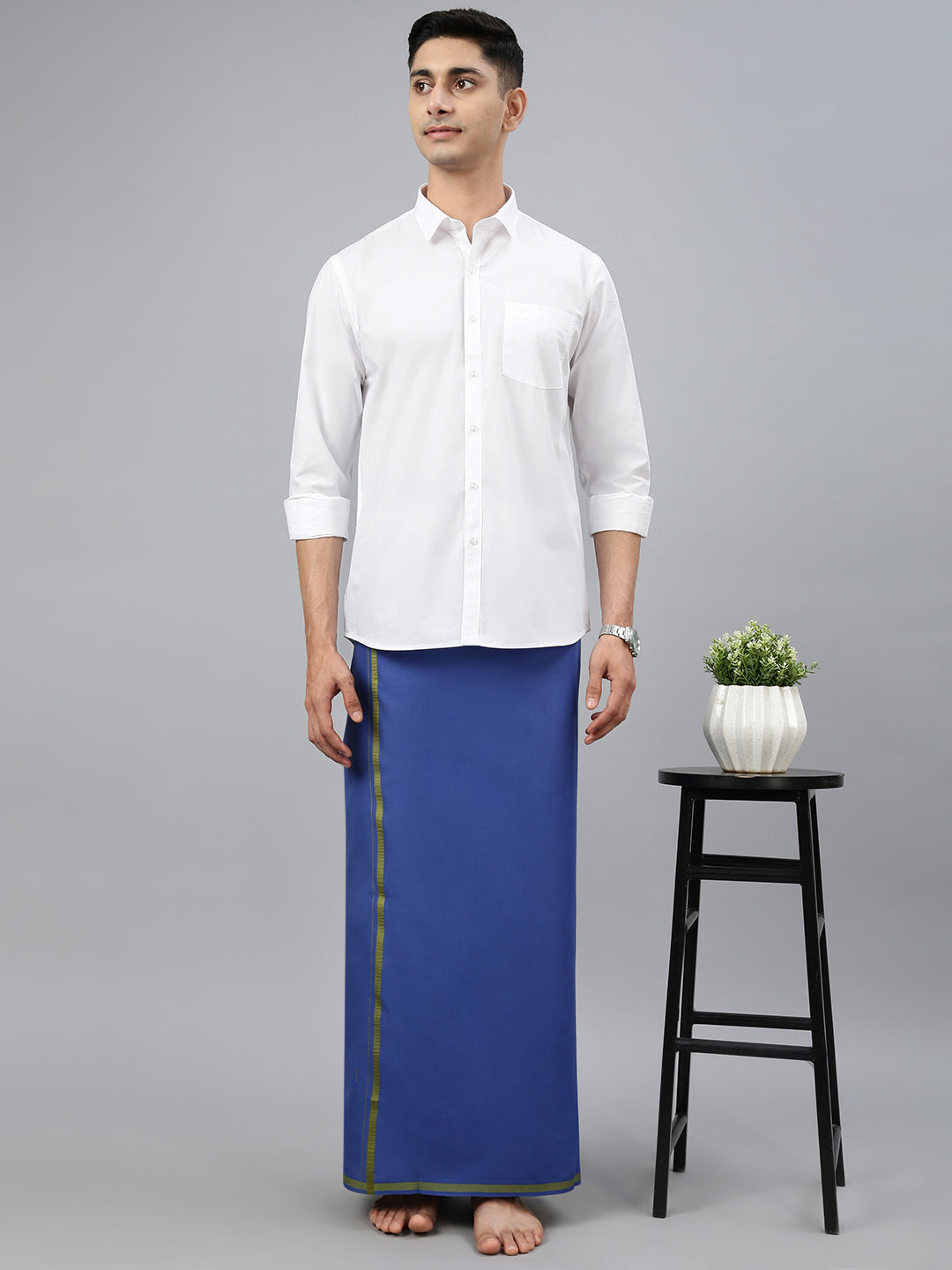 Crafted from 100% cotton, this single-layer dhoti offers a perfect blend of comfort and tradition. Its breathable and lightweight fabric ensures ease of movement, making it ideal for extended wear during festive or ceremonial occasions. The subtle Big border adds a refined touch, enhancing its classic and elegant appeal. Whether paired with a kurta or traditional shirt, this dhoti is a timeless choice for poojas, weddings, and cultural celebrations.