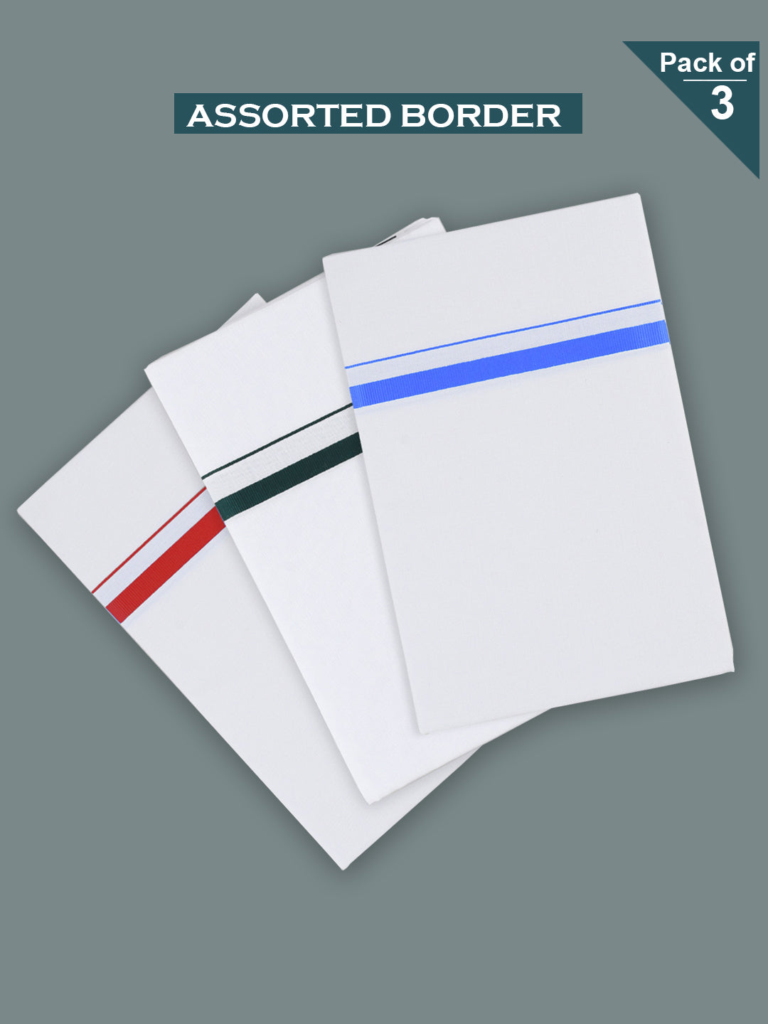 Men Cotton Blend Single Layer White Dhoti with Assorted Border Shivaa (Pack of 3)
