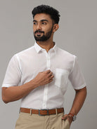 Men Linen Feel Half Sleeves White Shirt