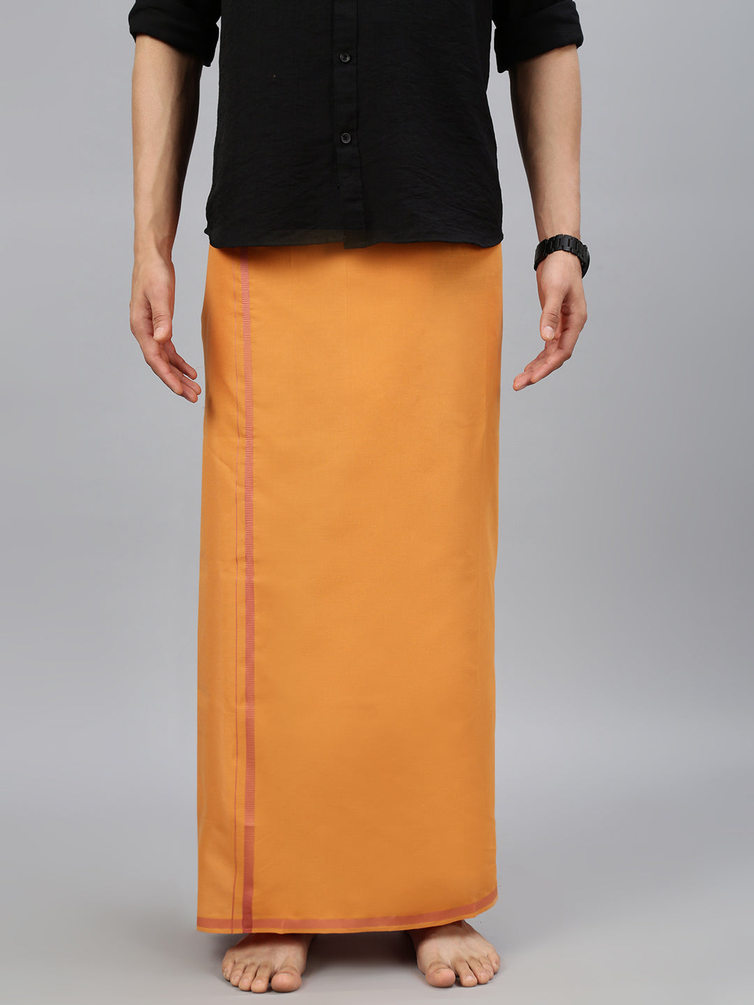 Crafted from 100% cotton, this single-layer dhoti offers a perfect blend of comfort and tradition. Its breathable and lightweight fabric ensures ease of movement, making it ideal for extended wear during festive or ceremonial occasions. The subtle Big border adds a refined touch, enhancing its classic and elegant appeal. Whether paired with a kurta or traditional shirt, this dhoti is a timeless choice for poojas, weddings, and cultural celebrations.