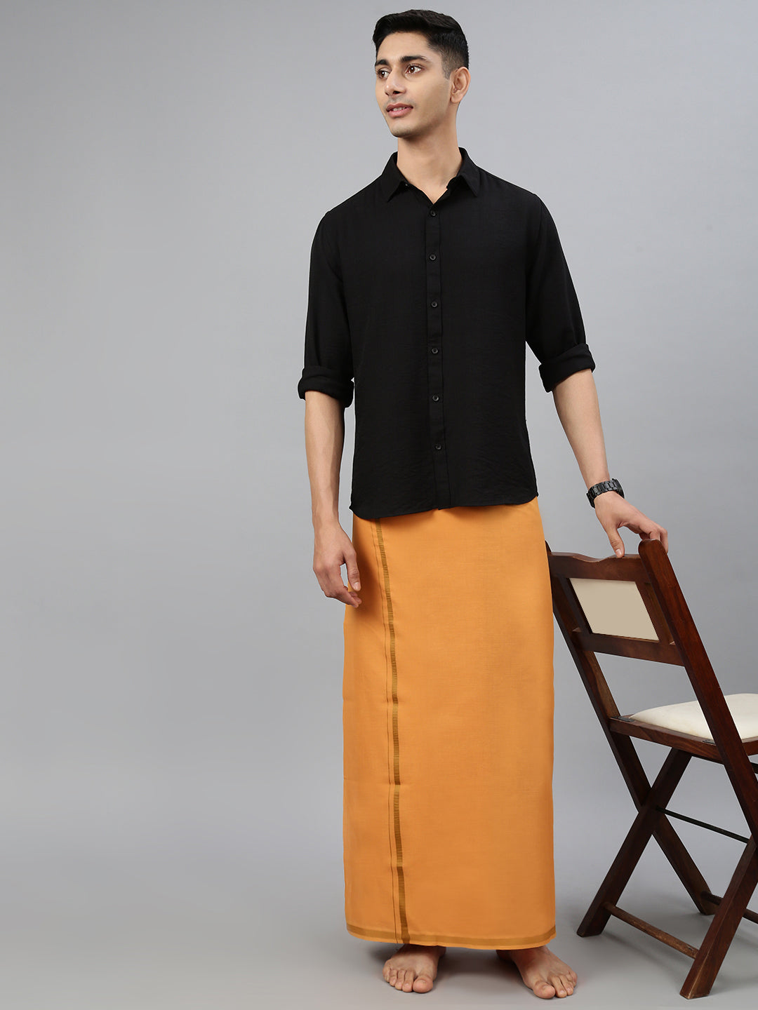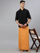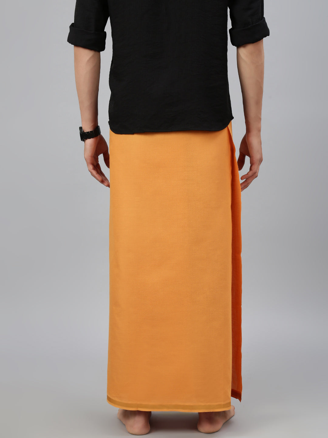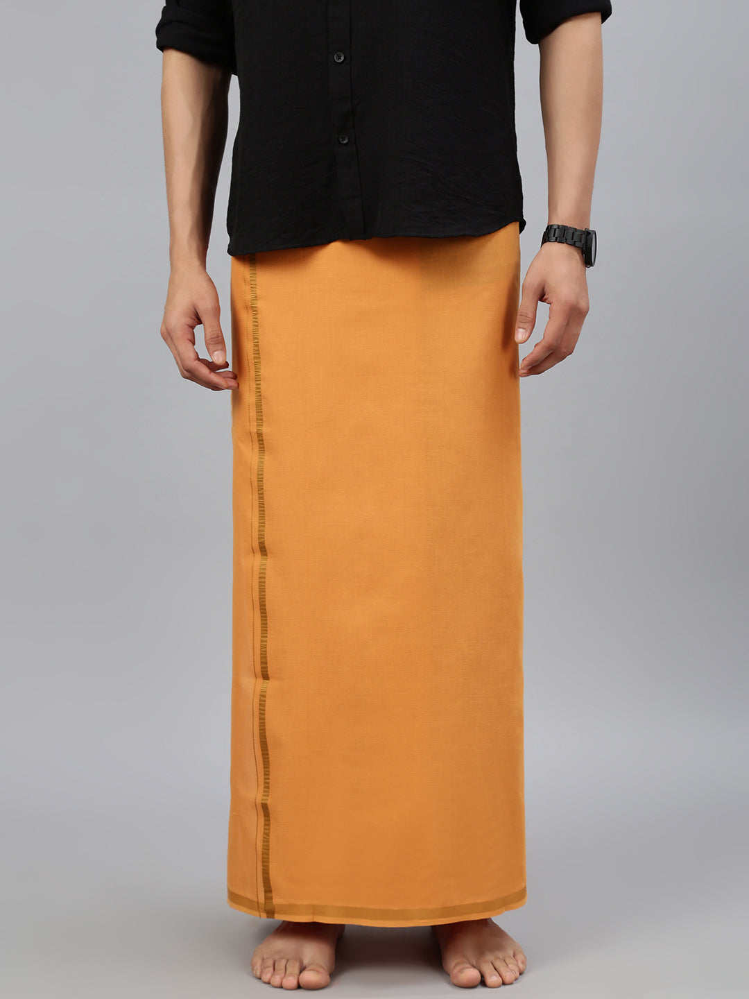 Crafted from 100% cotton, this single-layer dhoti offers a perfect blend of comfort and tradition. Its breathable and lightweight fabric ensures ease of movement, making it ideal for extended wear during festive or ceremonial occasions. The subtle Big border adds a refined touch, enhancing its classic and elegant appeal. Whether paired with a kurta or traditional shirt, this dhoti is a timeless choice for poojas, weddings, and cultural celebrations.