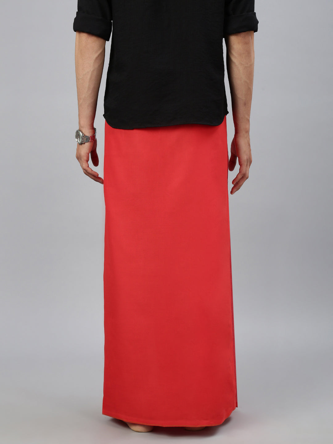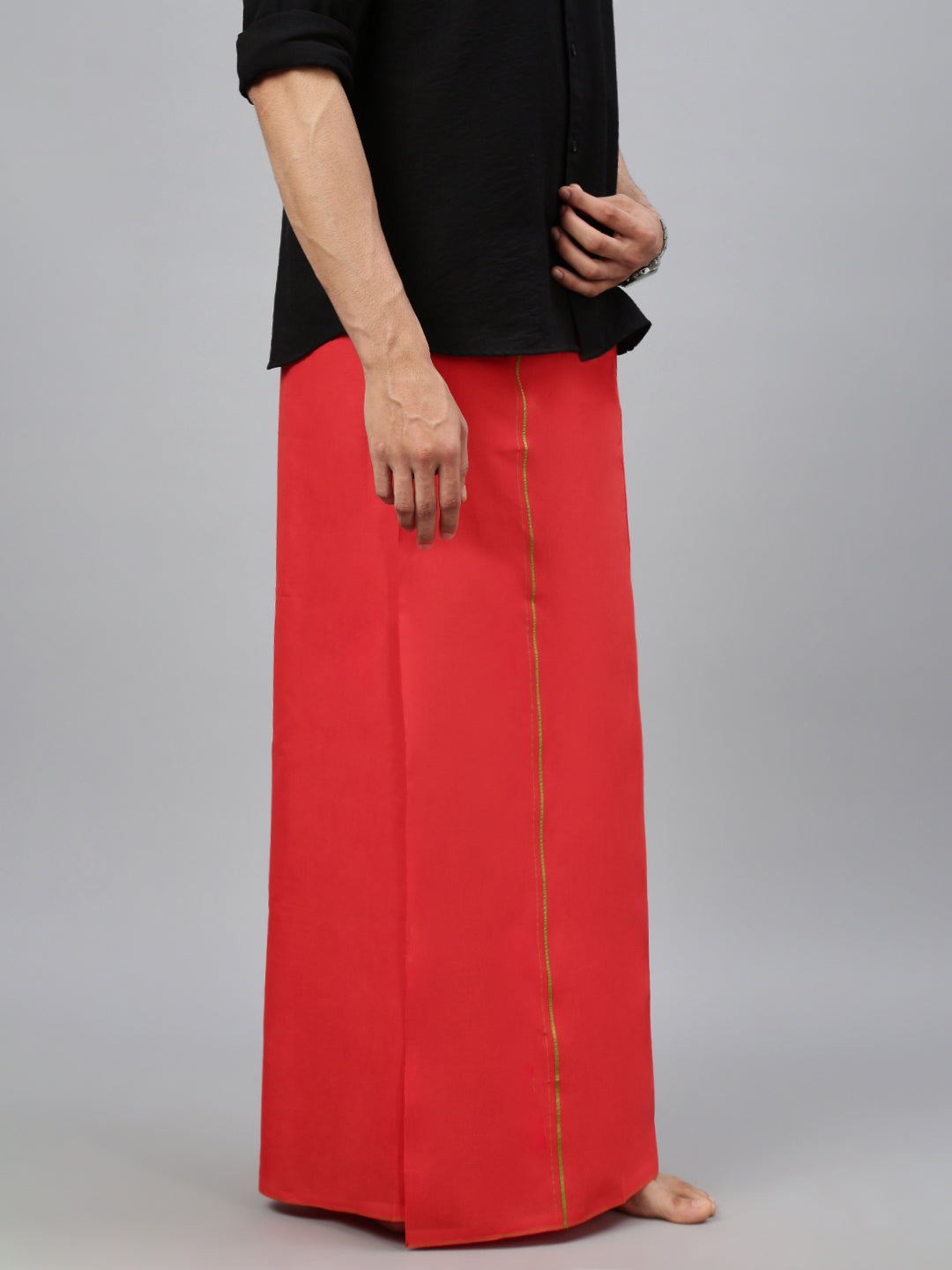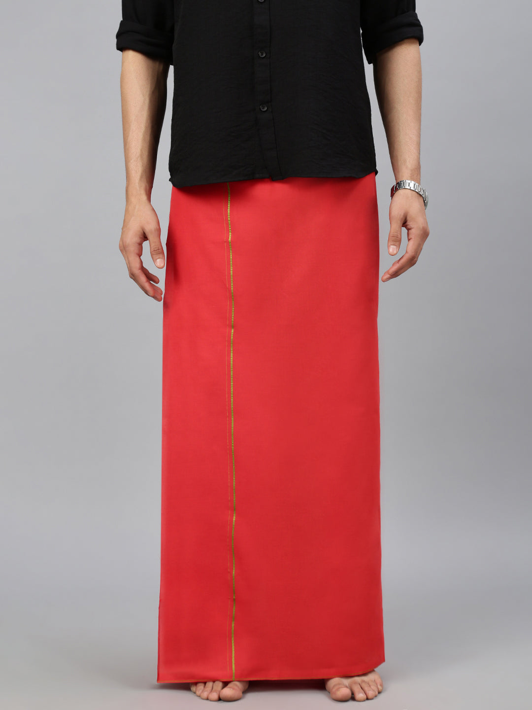 Crafted from 100% cotton, this single-layer dhoti offers a perfect blend of comfort and tradition. Its breathable and lightweight fabric ensures ease of movement, making it ideal for extended wear during festive or ceremonial occasions. The subtle small border adds a refined touch, enhancing its classic and elegant appeal. Whether paired with a kurta or traditional shirt, this dhoti is a timeless choice for poojas, weddings, and cultural celebrations.
