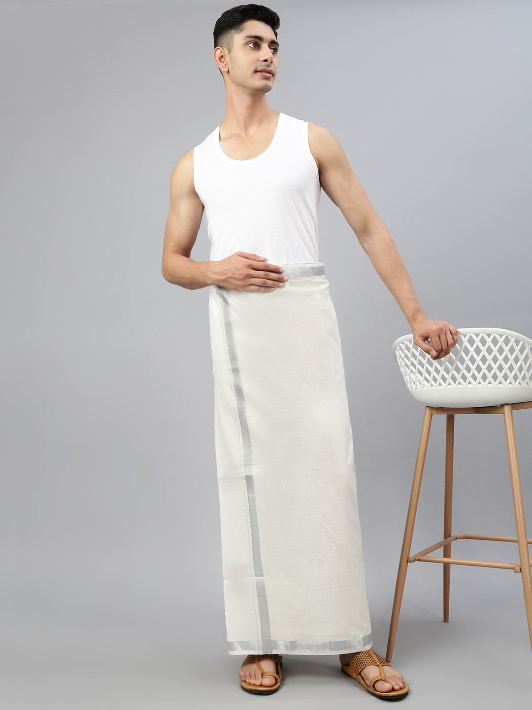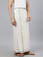 Men Tissue Readymade Single Layer Silver Dhoti with Jari Border