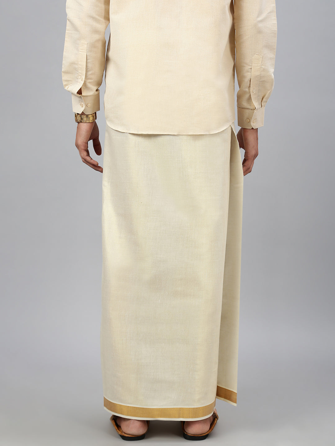 Make a sophisticated statement at any traditional event with this elegant Men’s Gold Tissue Dhoti, crafted from a single lightweight layer for breathable comfort and graceful drape. The subtle sheen of the Gold tissue fabric is perfectly complemented by a finely woven Jari (Zari) border, adding a touch of festive richness and timeless charm.This dhoti is ideal for weddings, poojas, and cultural celebrations—combining traditional aesthetics with modern simplicity. Easy to wear and manage, it reflects effortless elegance in every fold.