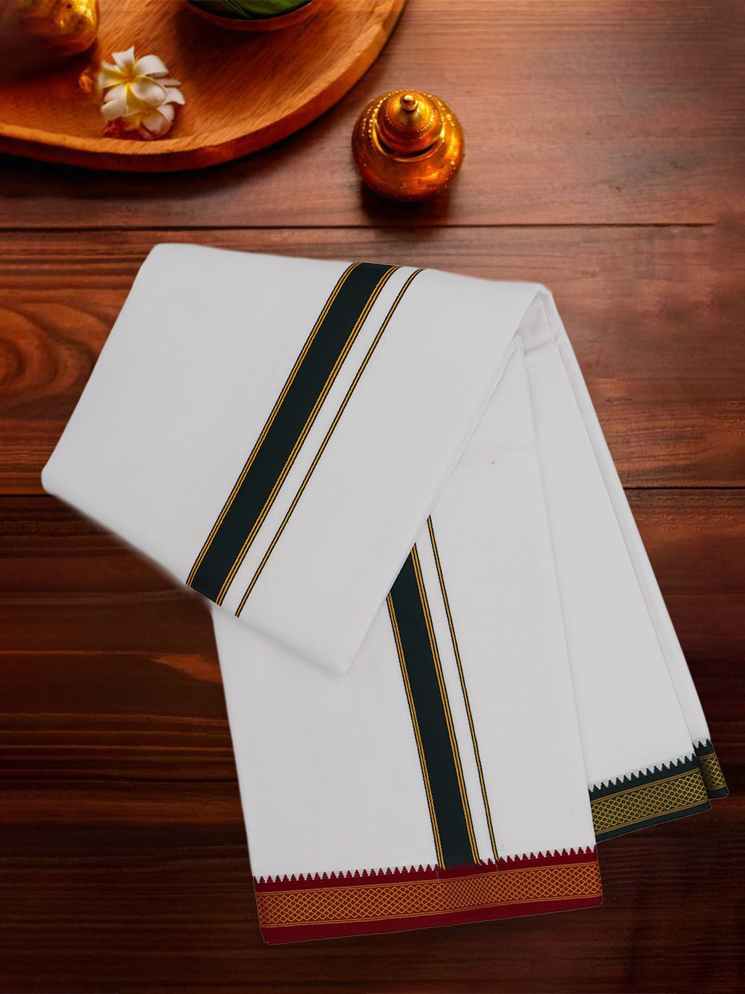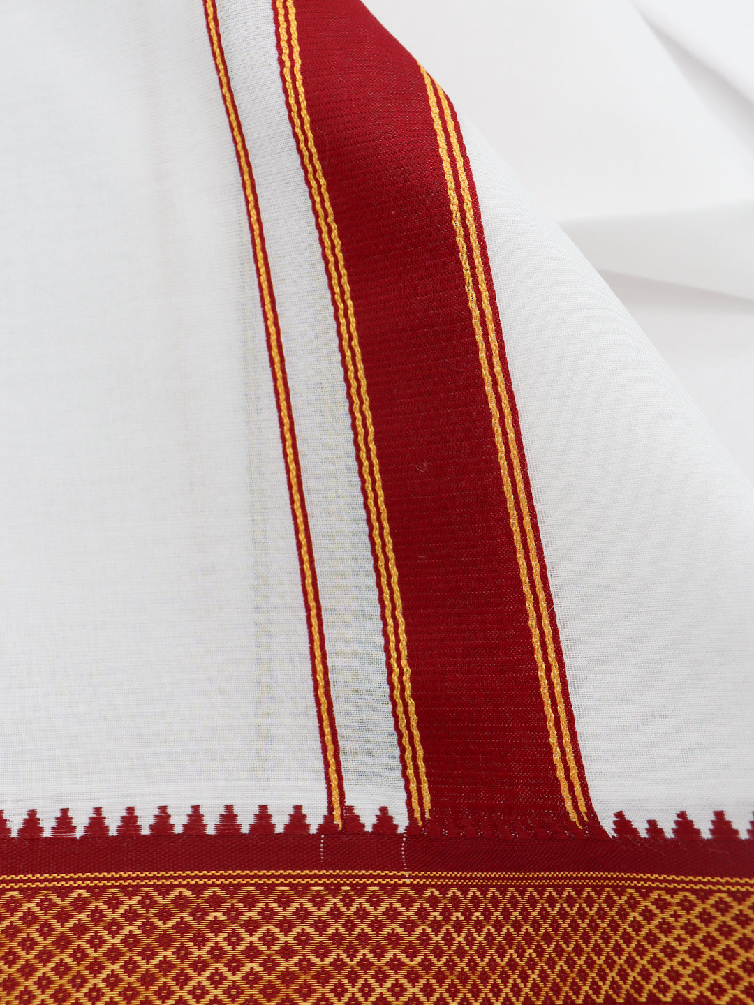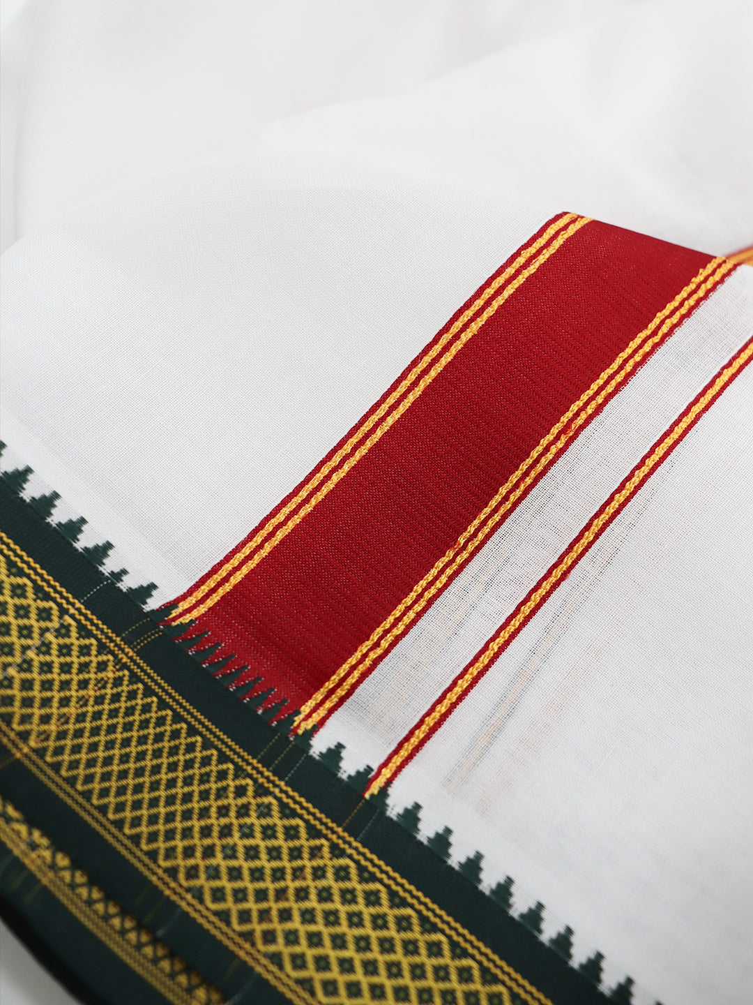 Men’s cotton white Panchakacham with towel, crafted from soft and breathable fabric for superior comfort. This traditional set features an elegant fancy jari border in maroon and green, adding a rich and classic touch. Ideal for poojas, temple wear, festivals, and traditional ceremonies, it offers both cultural authenticity and everyday comfort.