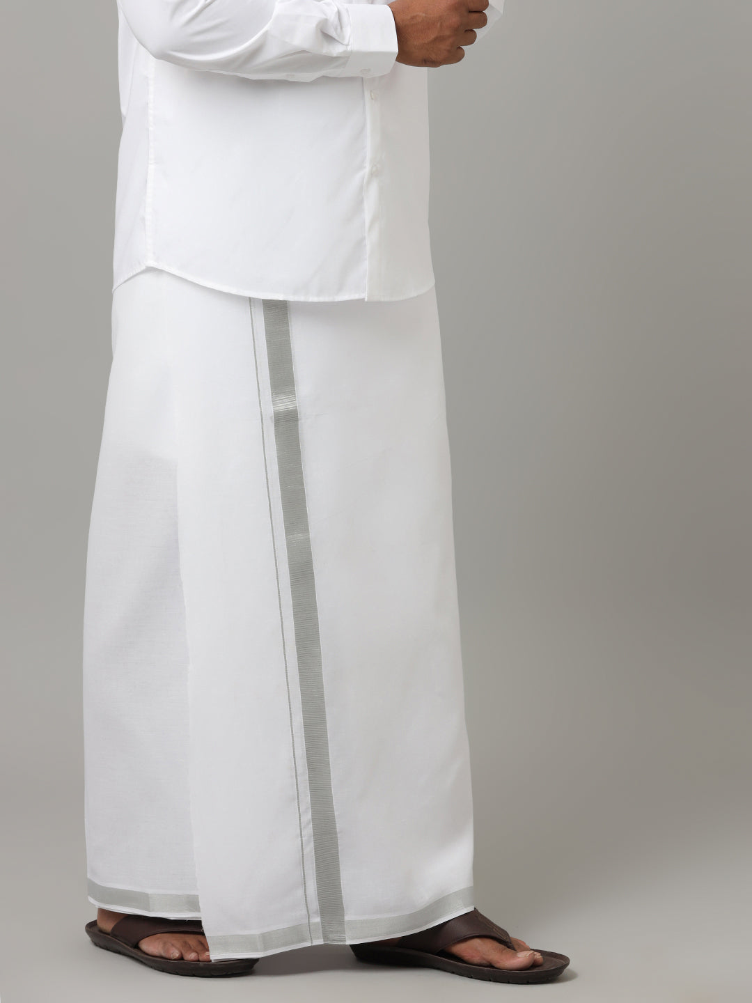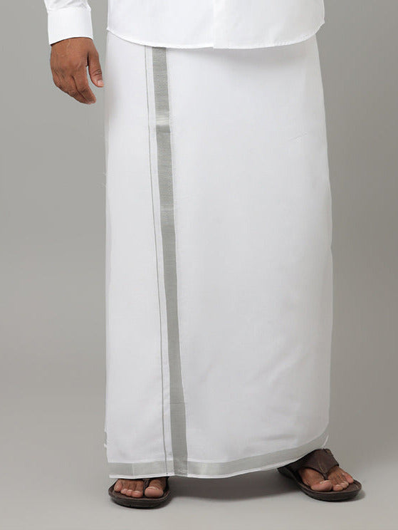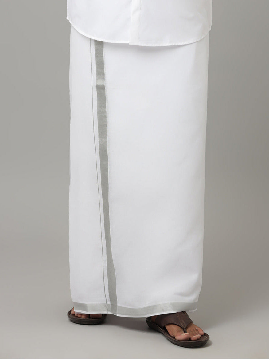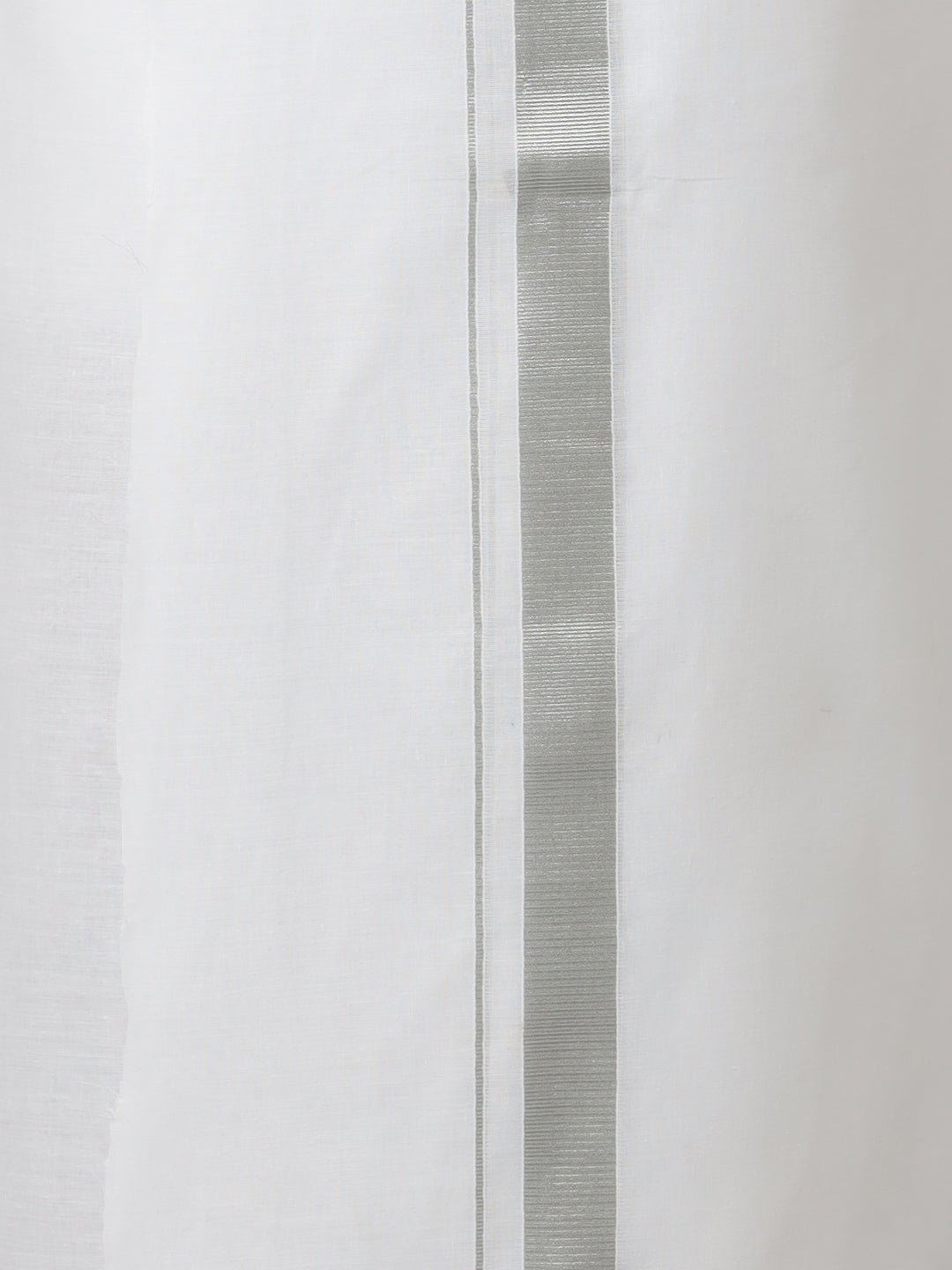 Men Cotton Blend Single Layer White Dhoti with 3/4" Silver Jari Border Bramma