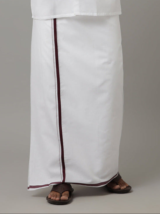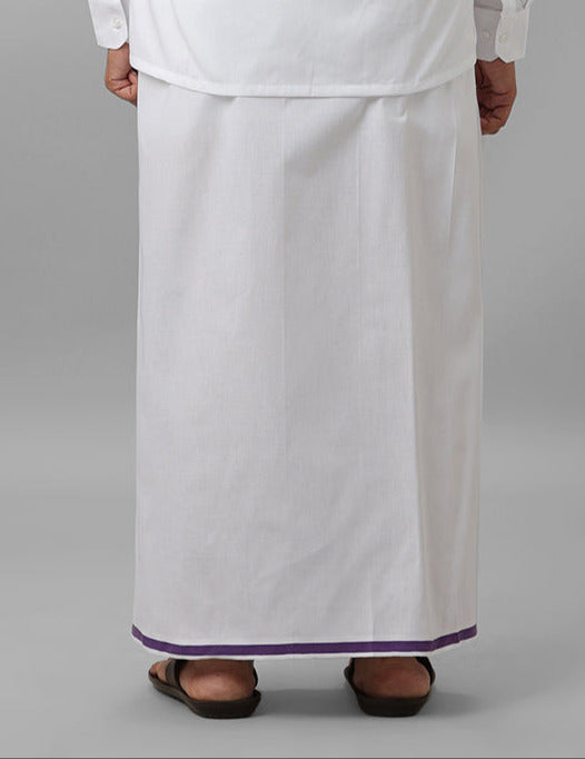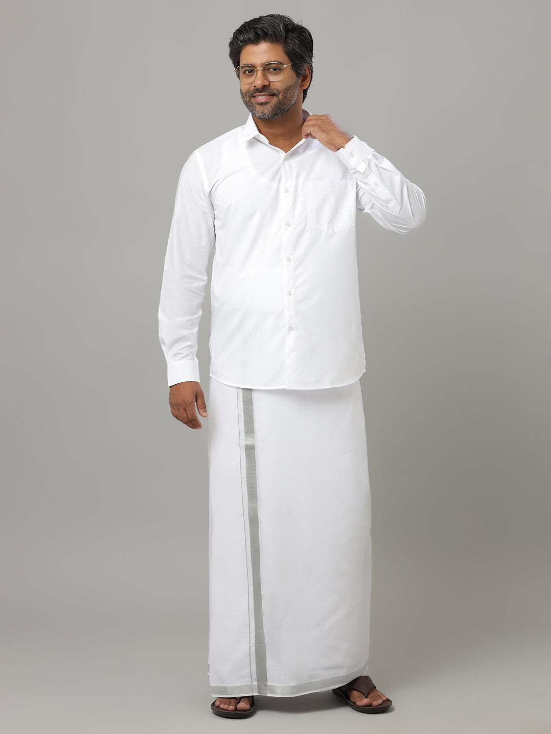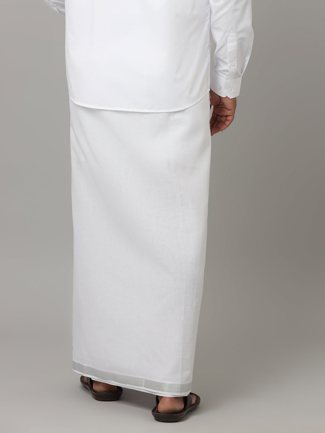 Men Cotton Blend Single Layer White Dhoti with 3/4" Silver Jari Border Bramma
