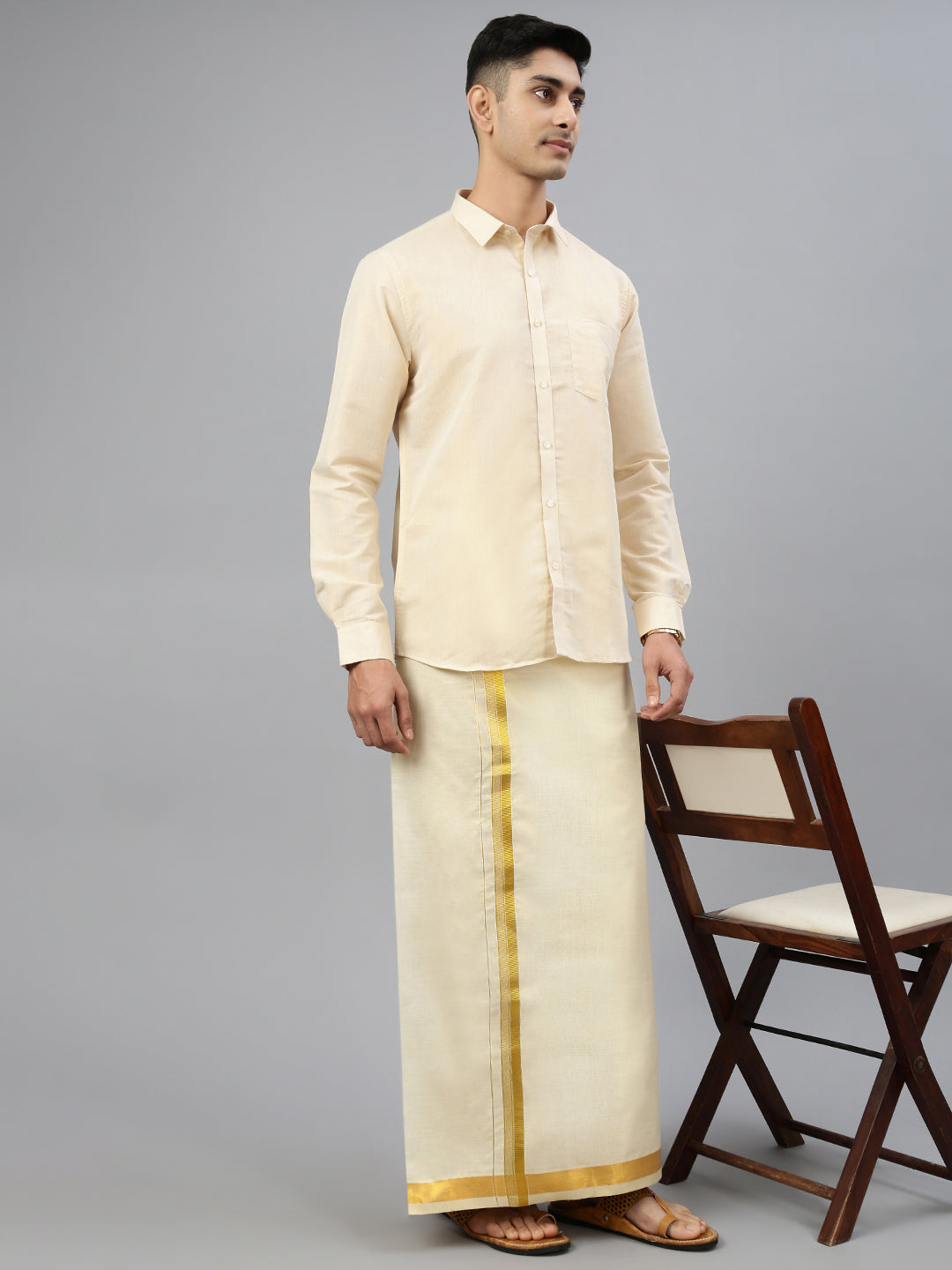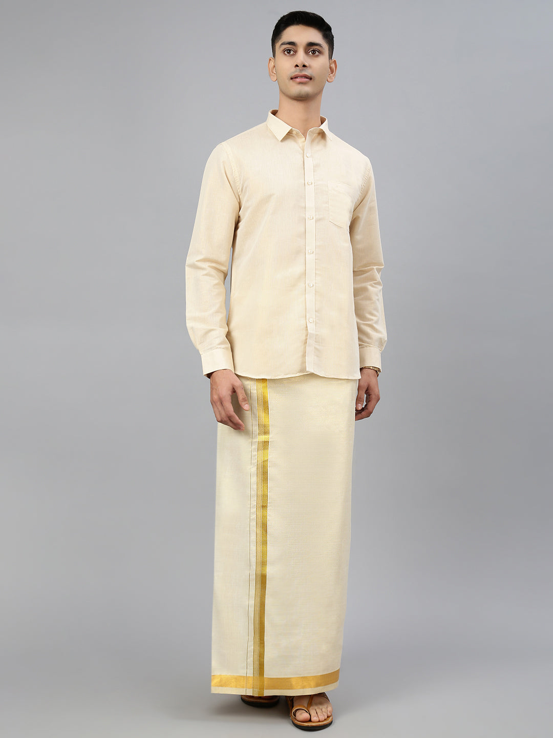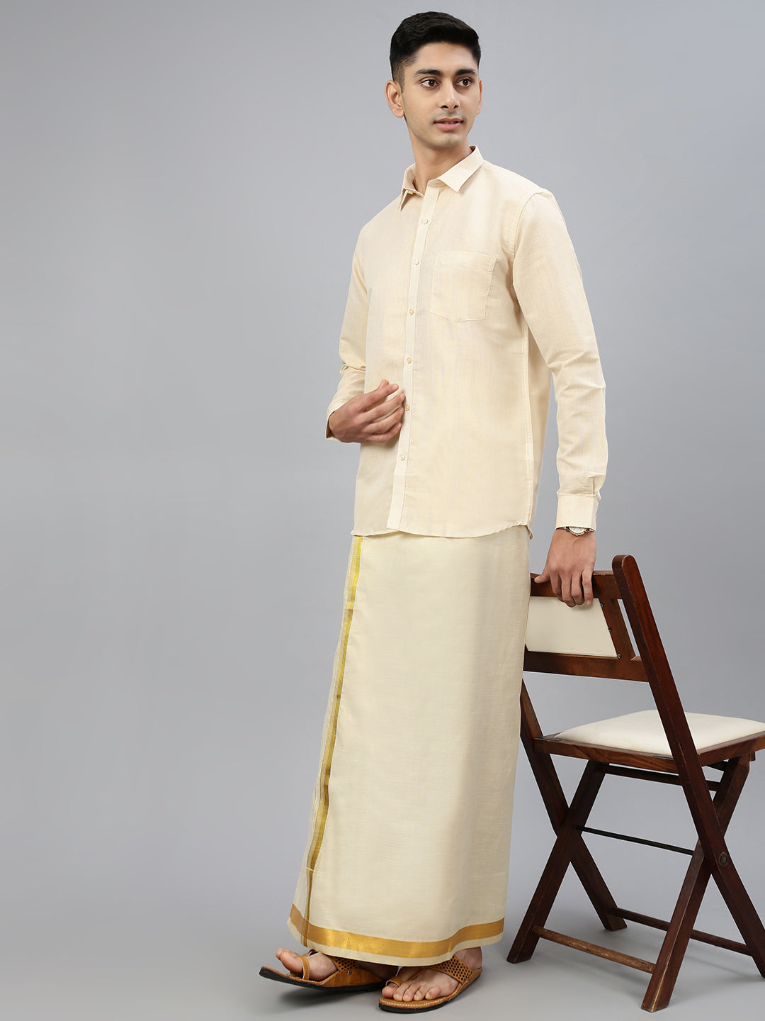 Men Tissue Full Sleeves Shirt and Dhoti Set Gold