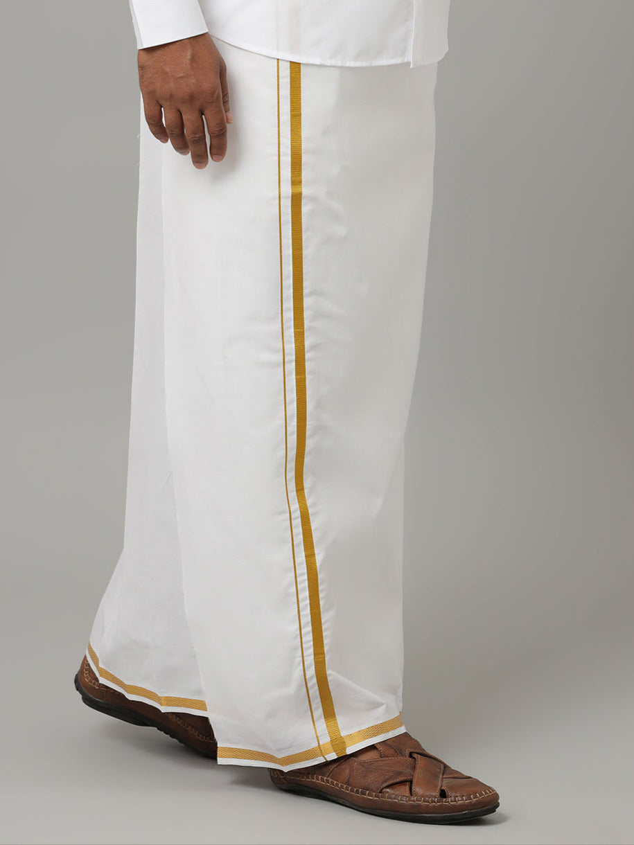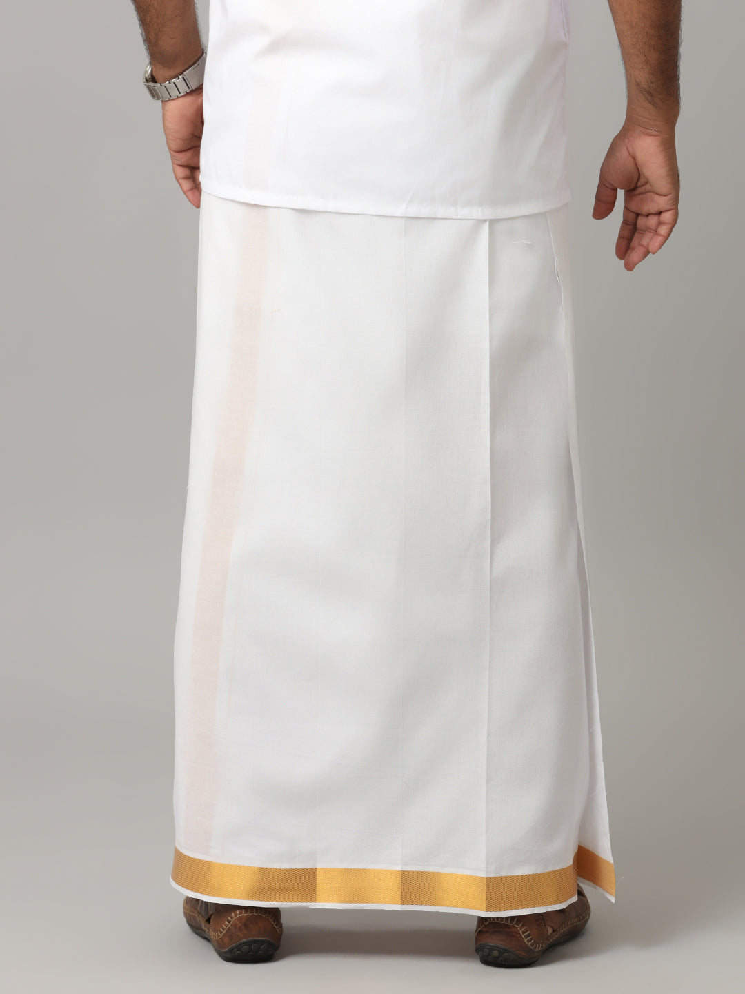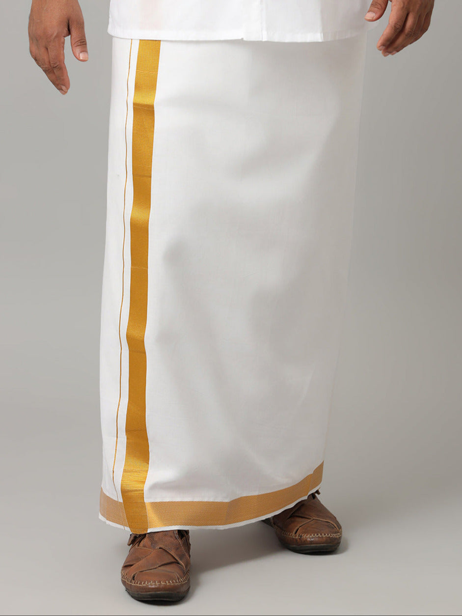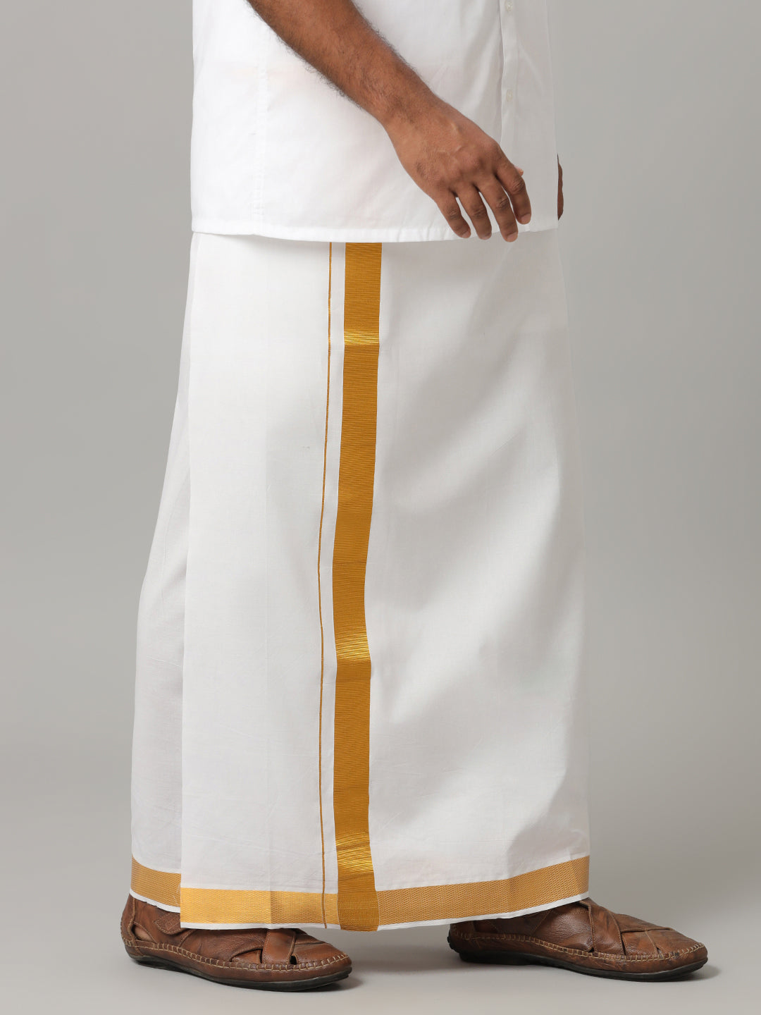 Men Cotton Blend Single Layer White Dhoti with 1/2" Gold Jari Border Kanishka