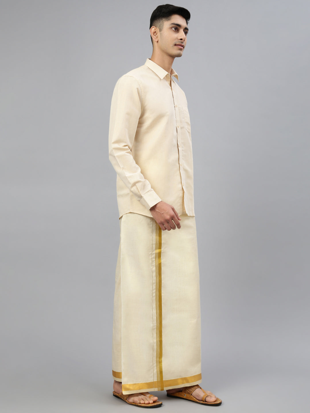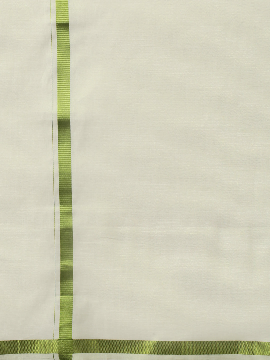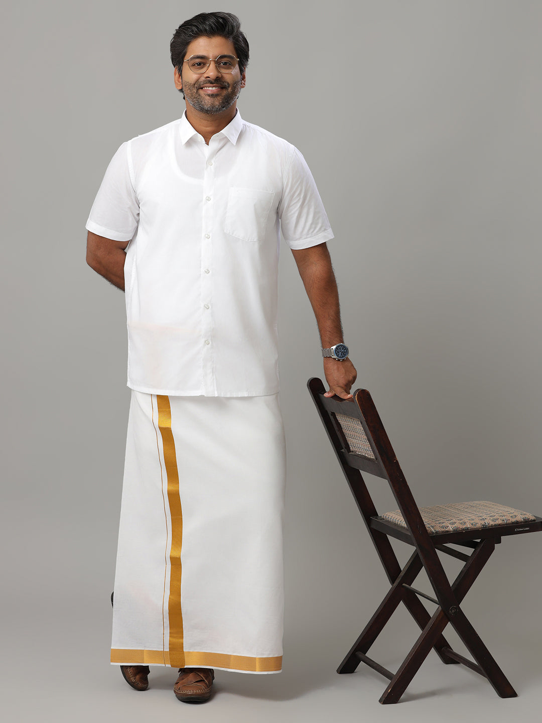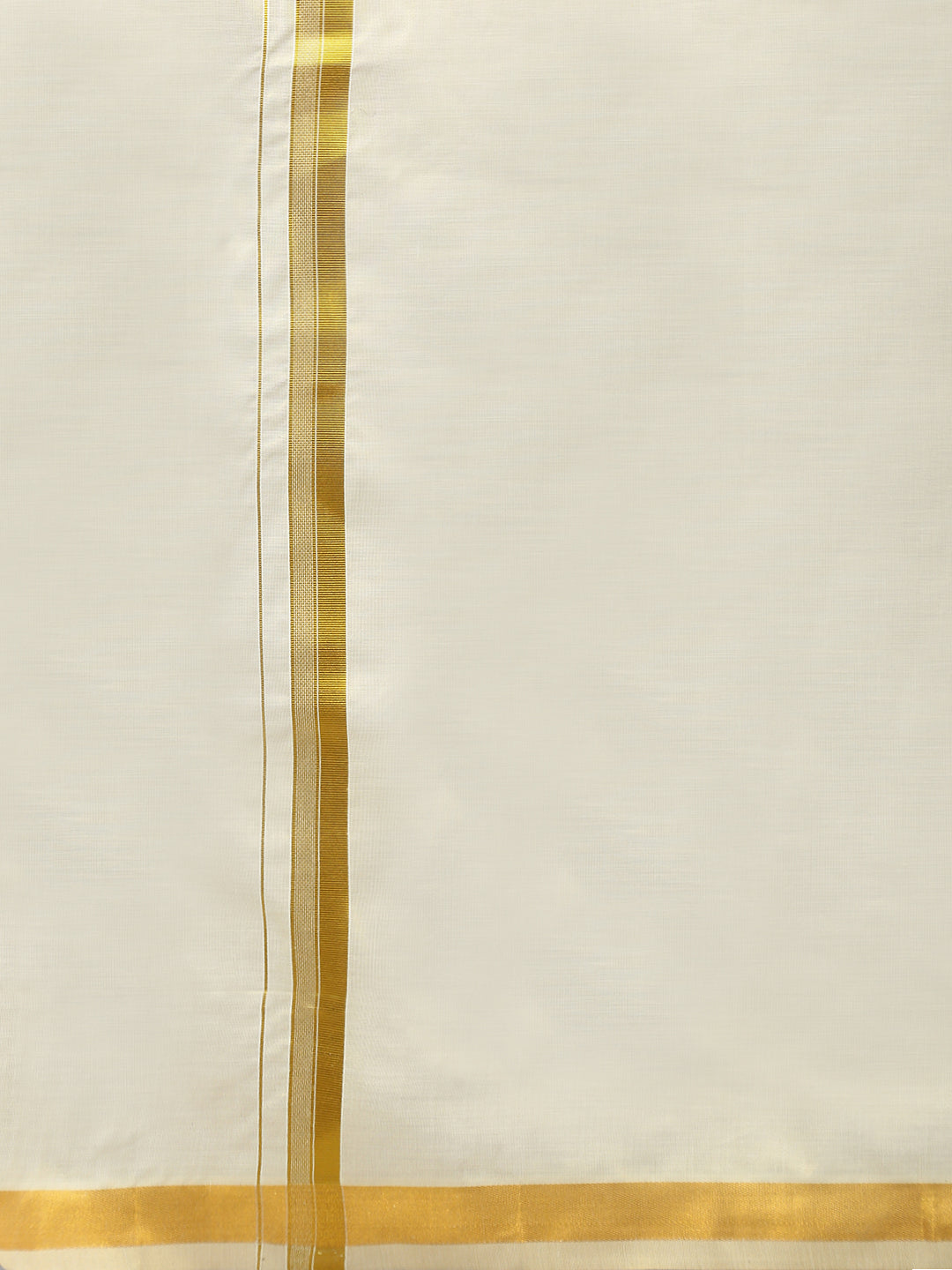 Men Cotton Blend Single Layer White Dhoti with 1/2" Gold Jari Border Kanishka