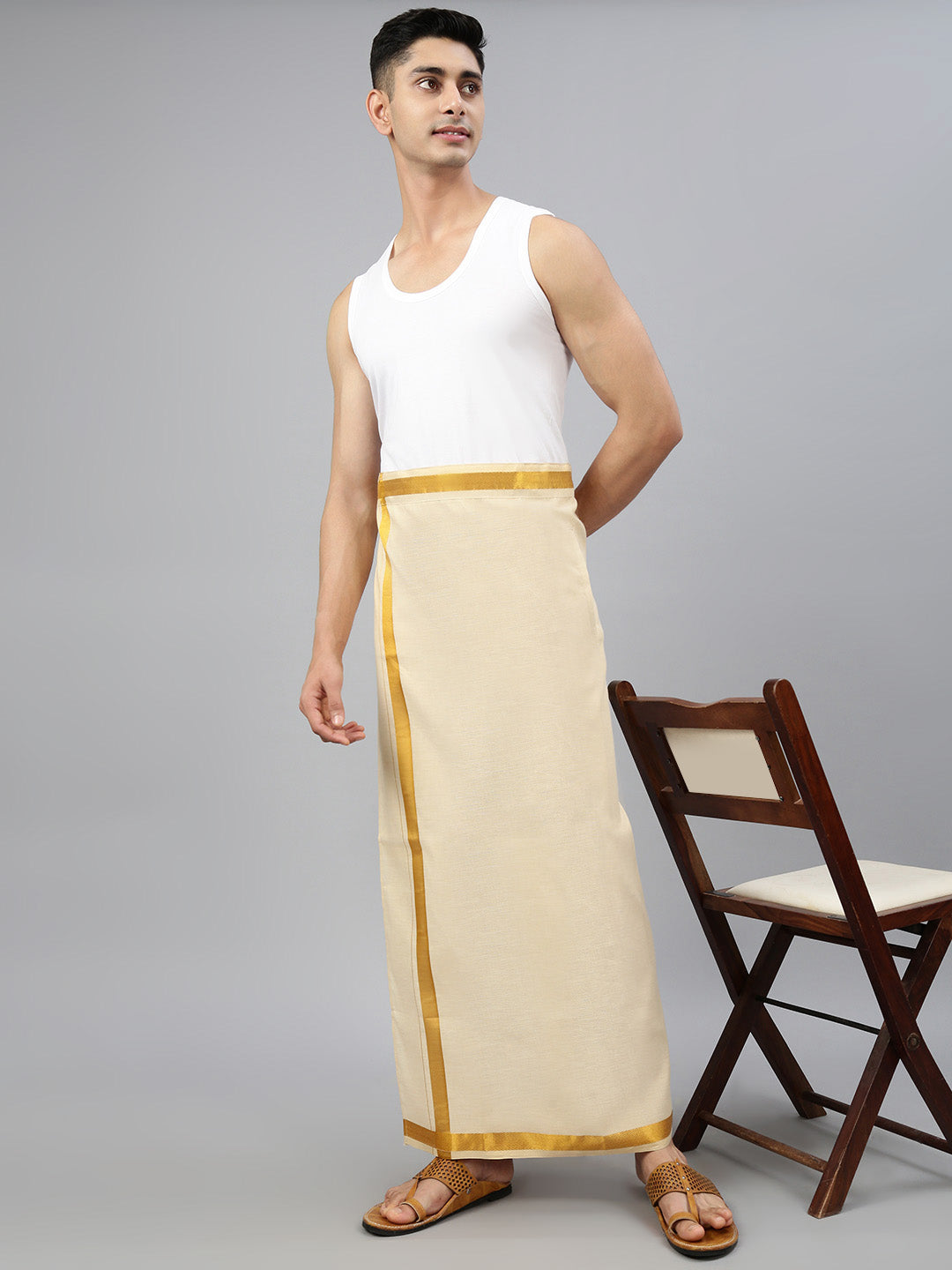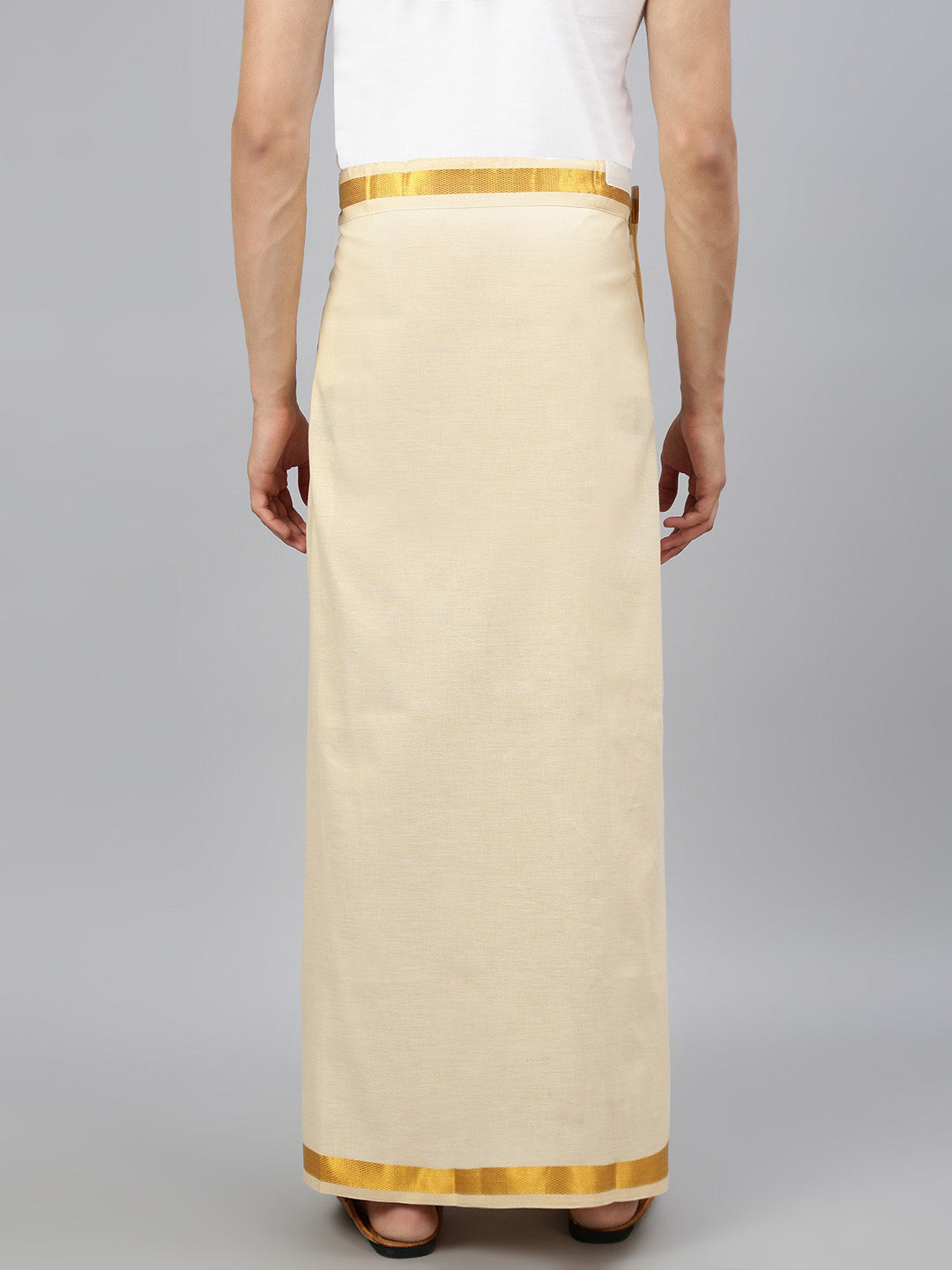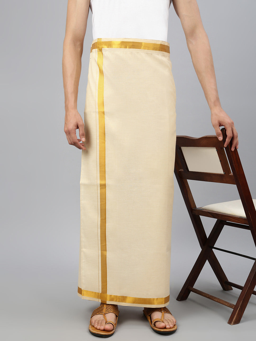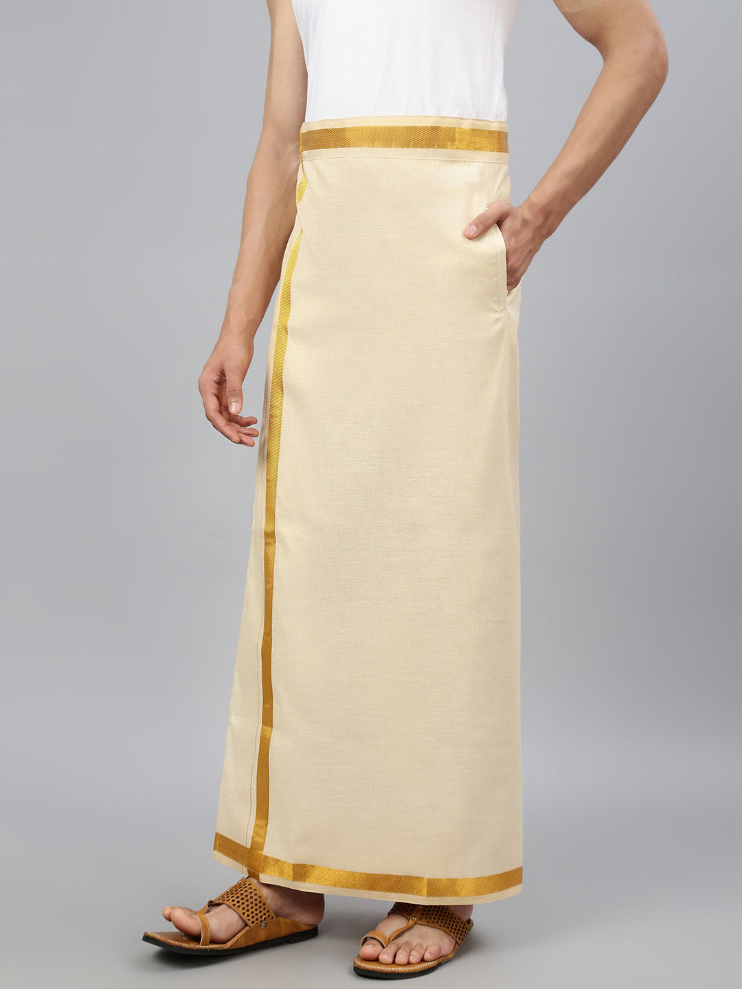 Men Readymade Single Layer Cream Dhoti with Gold Jari Border