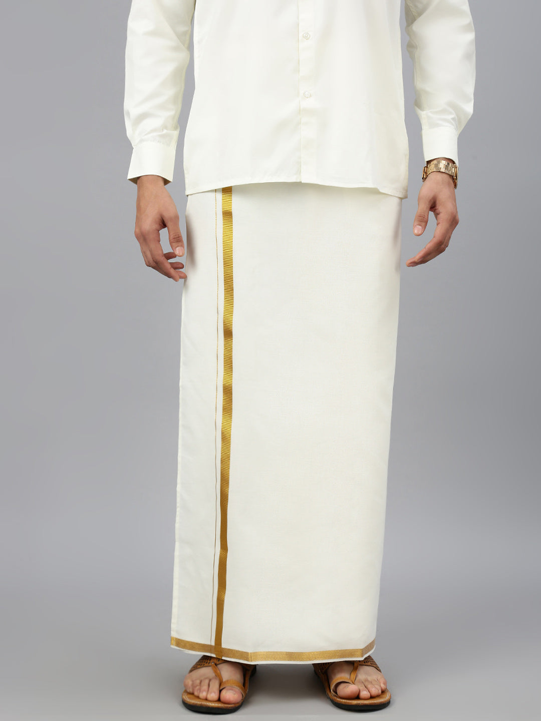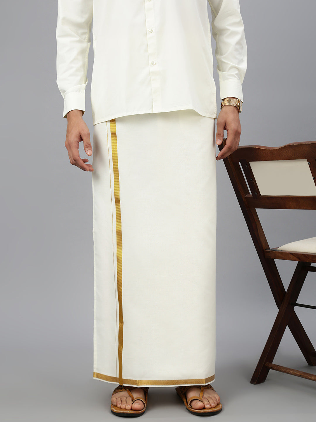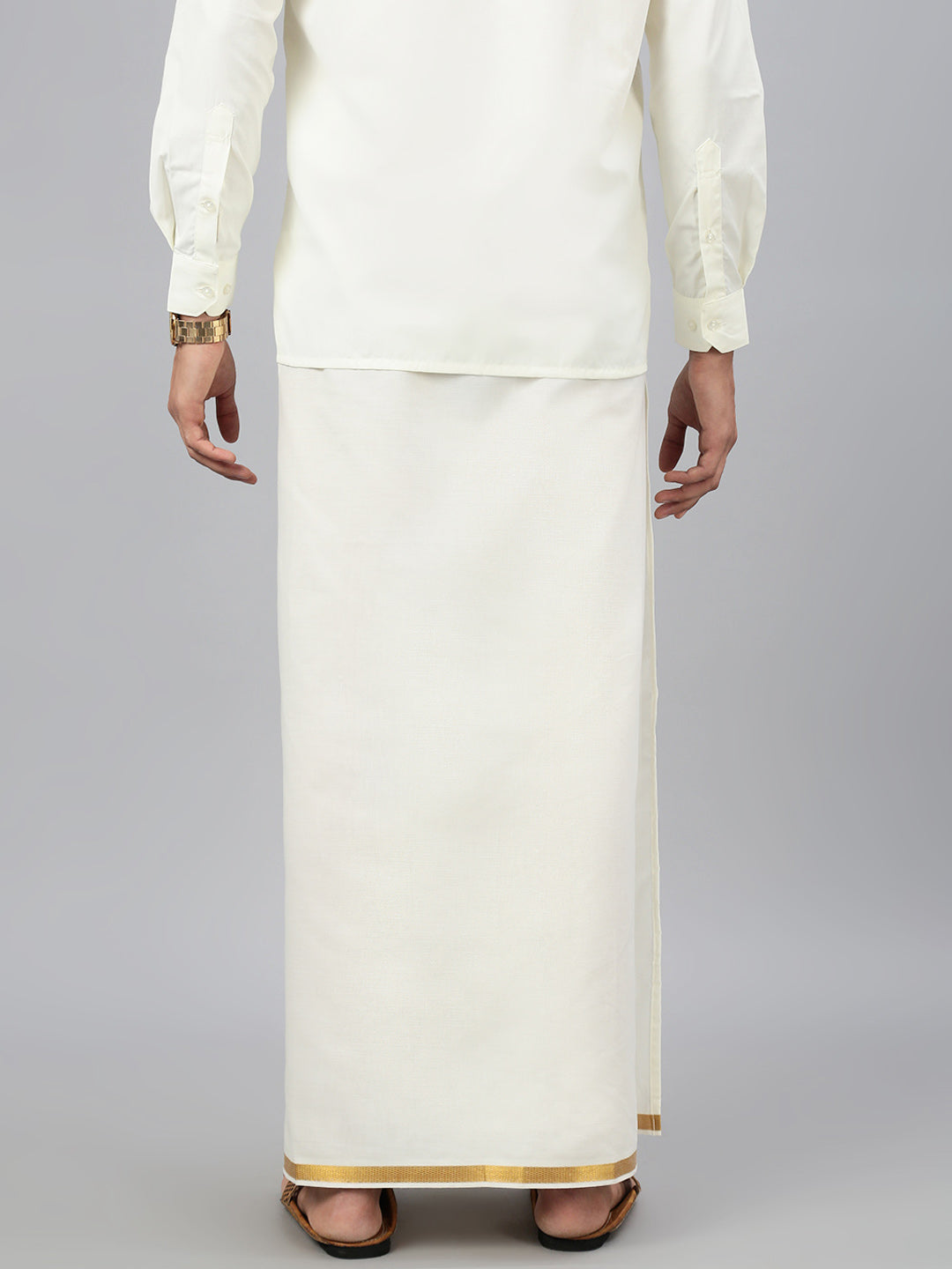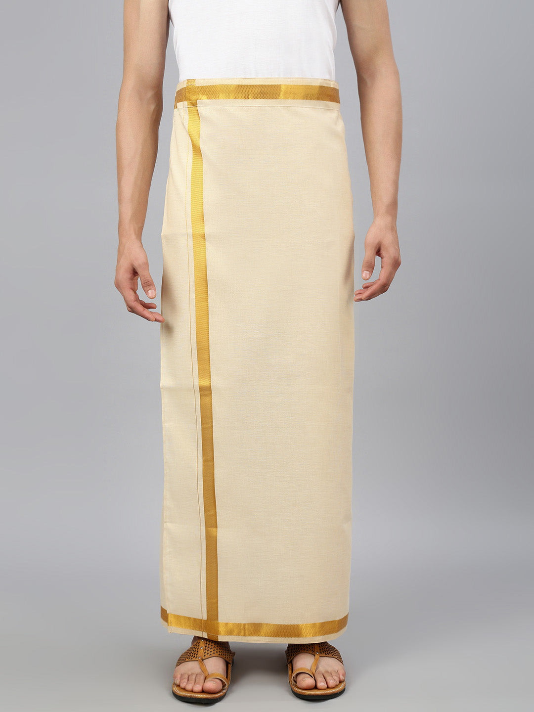 Men Readymade Single Layer Cream Dhoti with Gold Jari Border