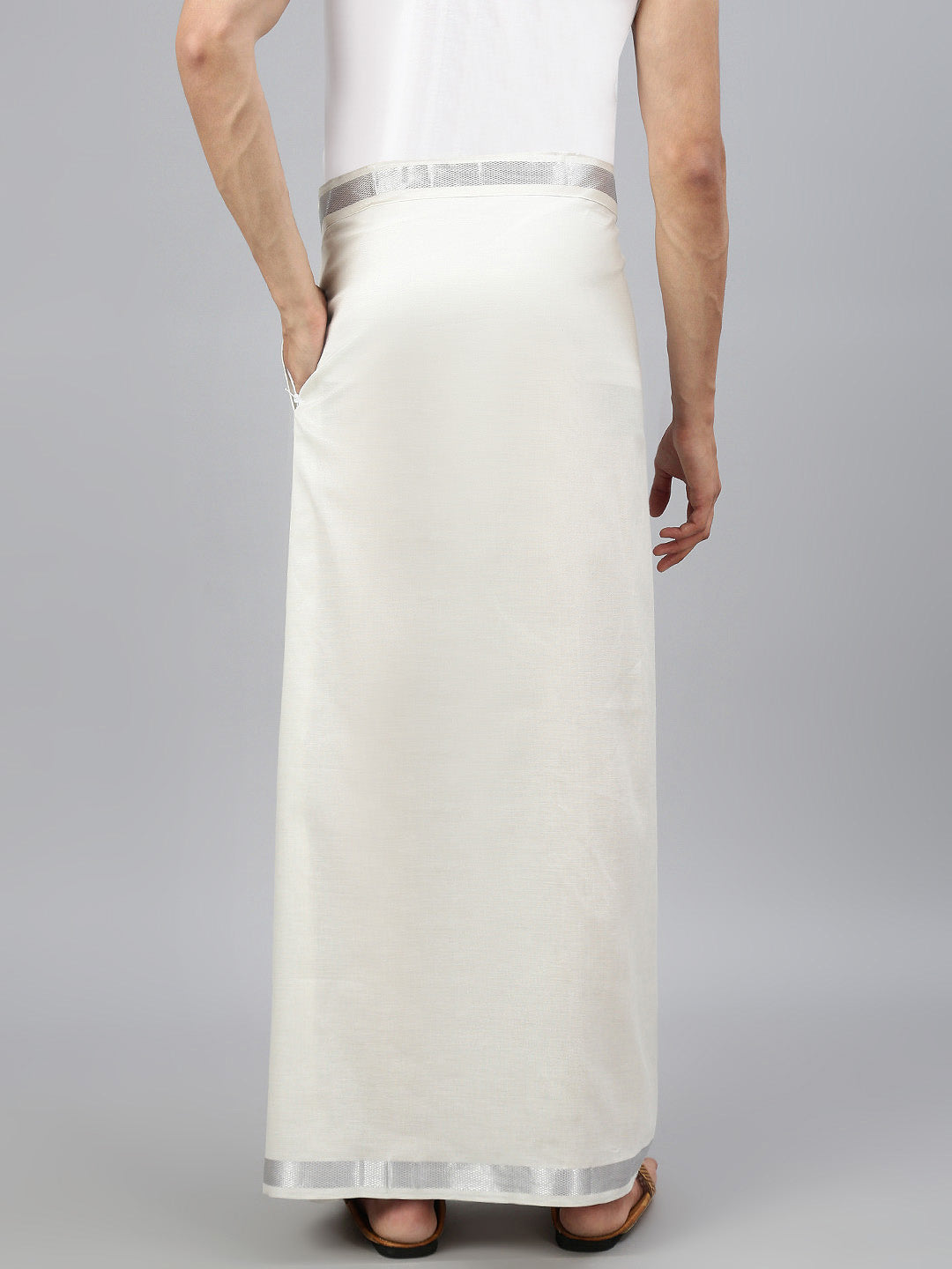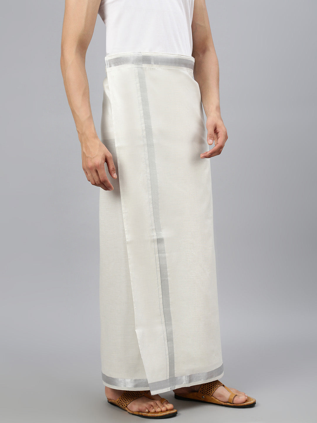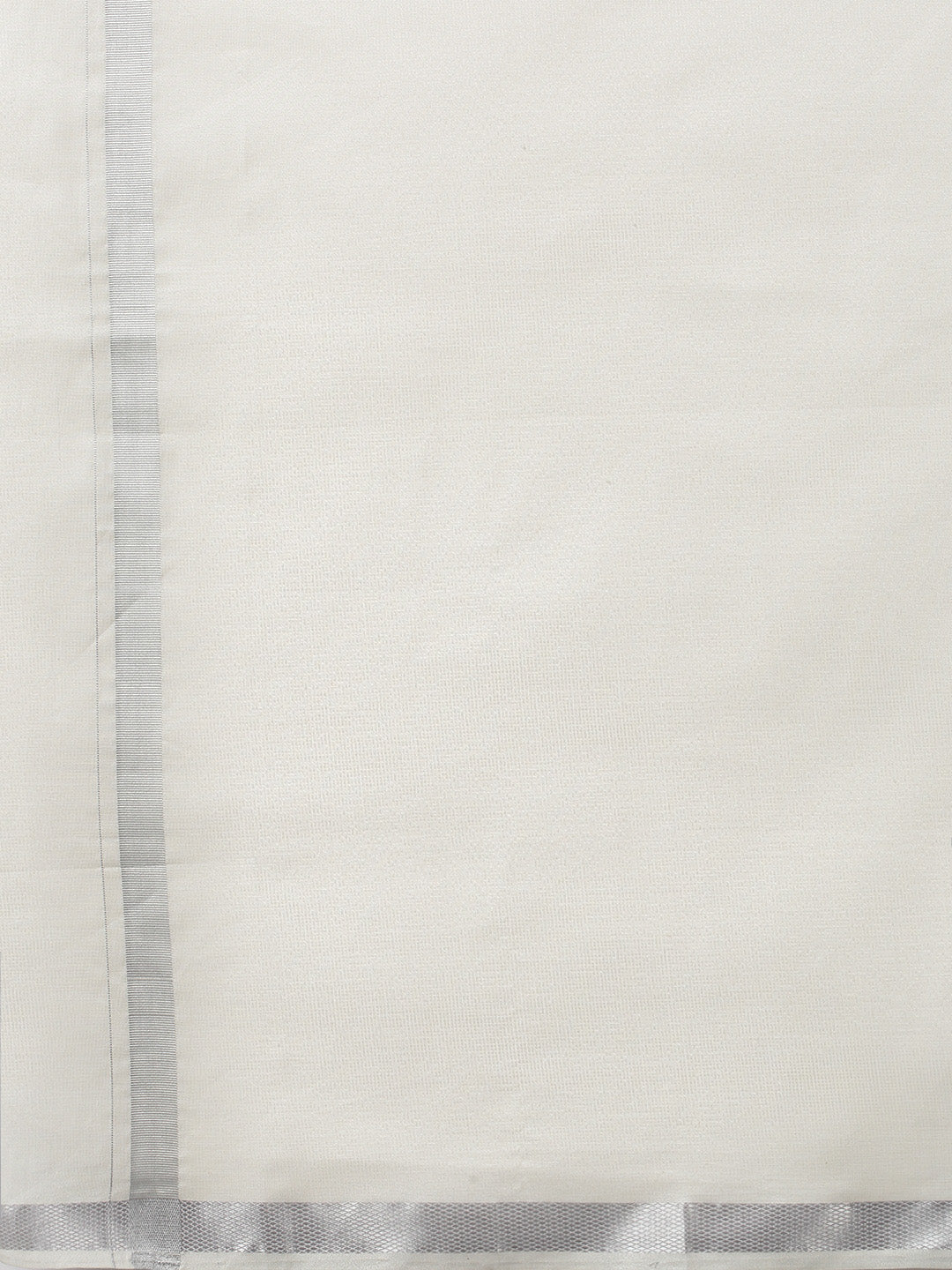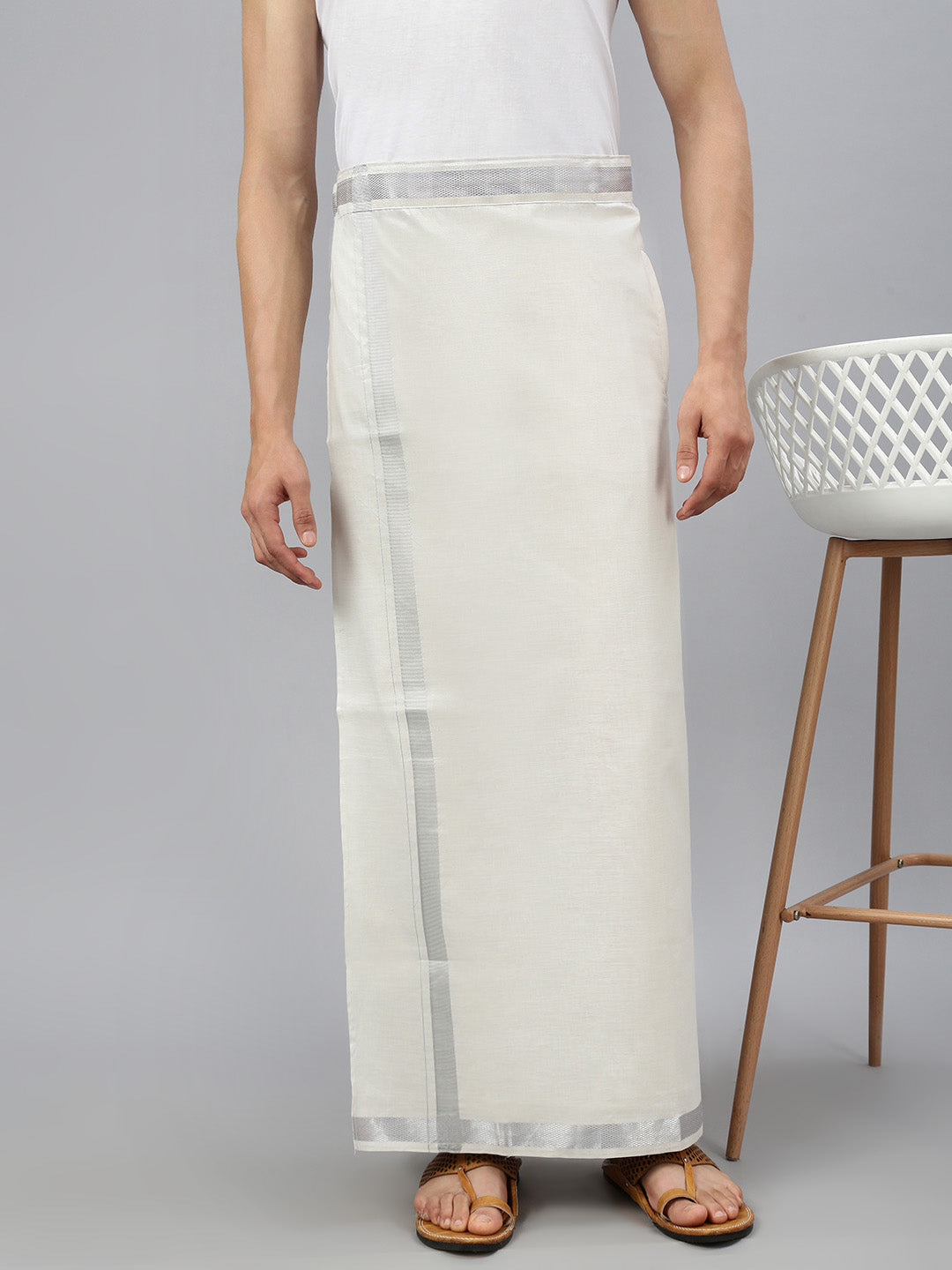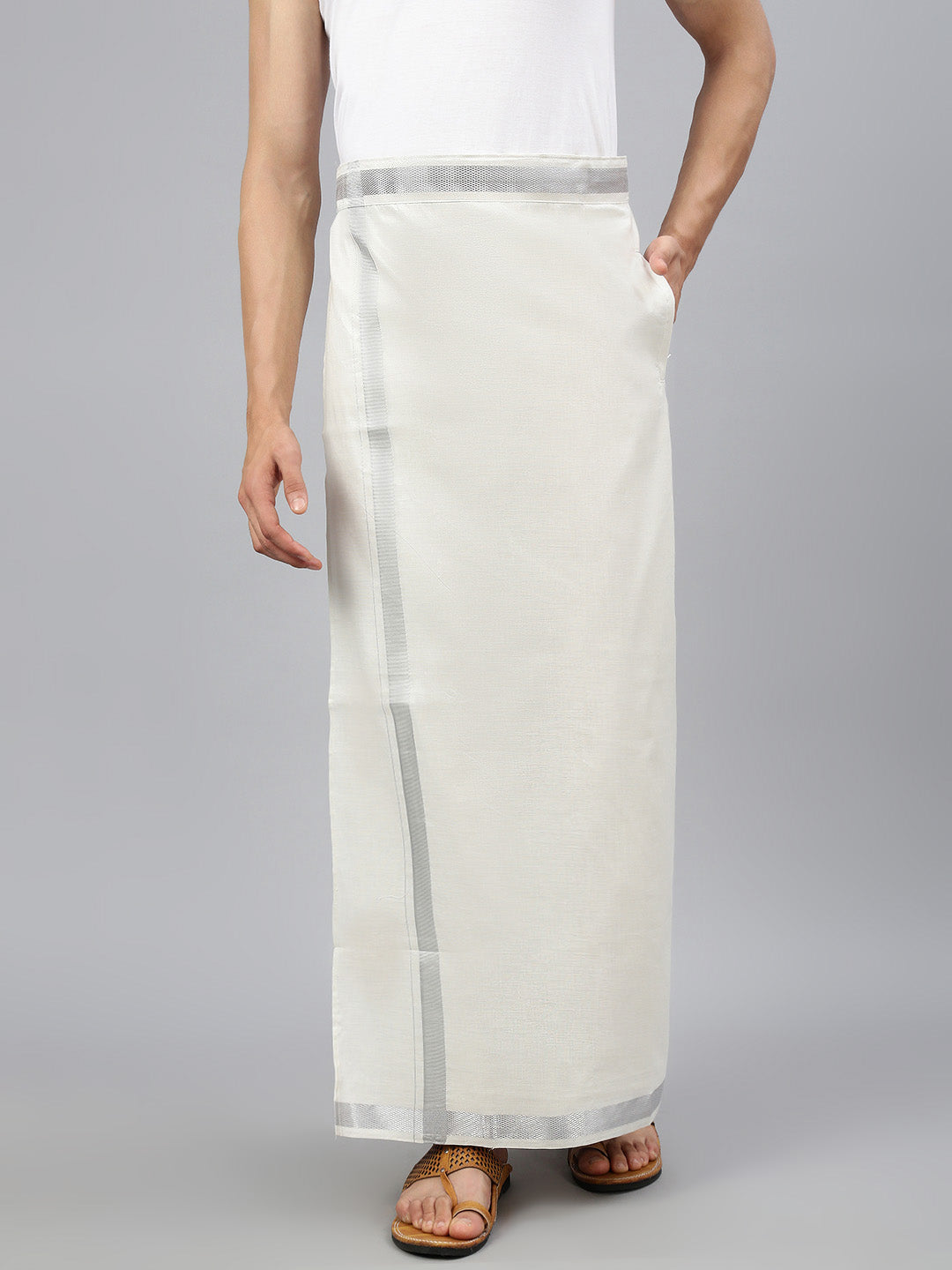 Men Tissue Readymade Single Layer Silver Dhoti with Jari Border