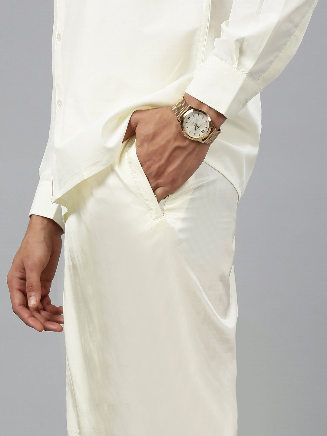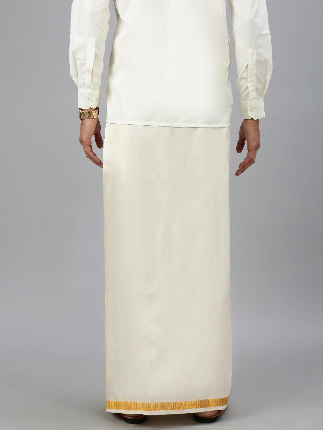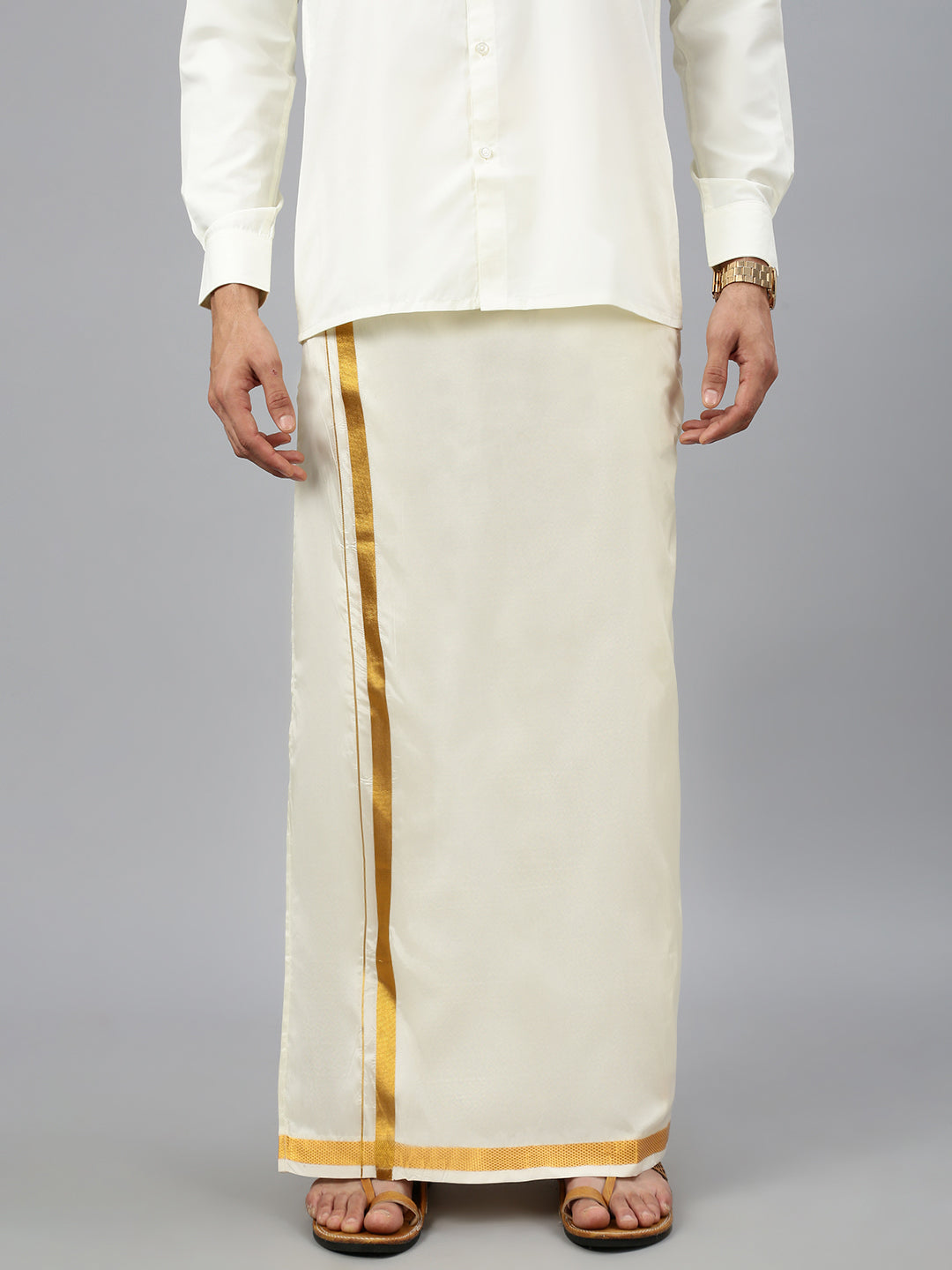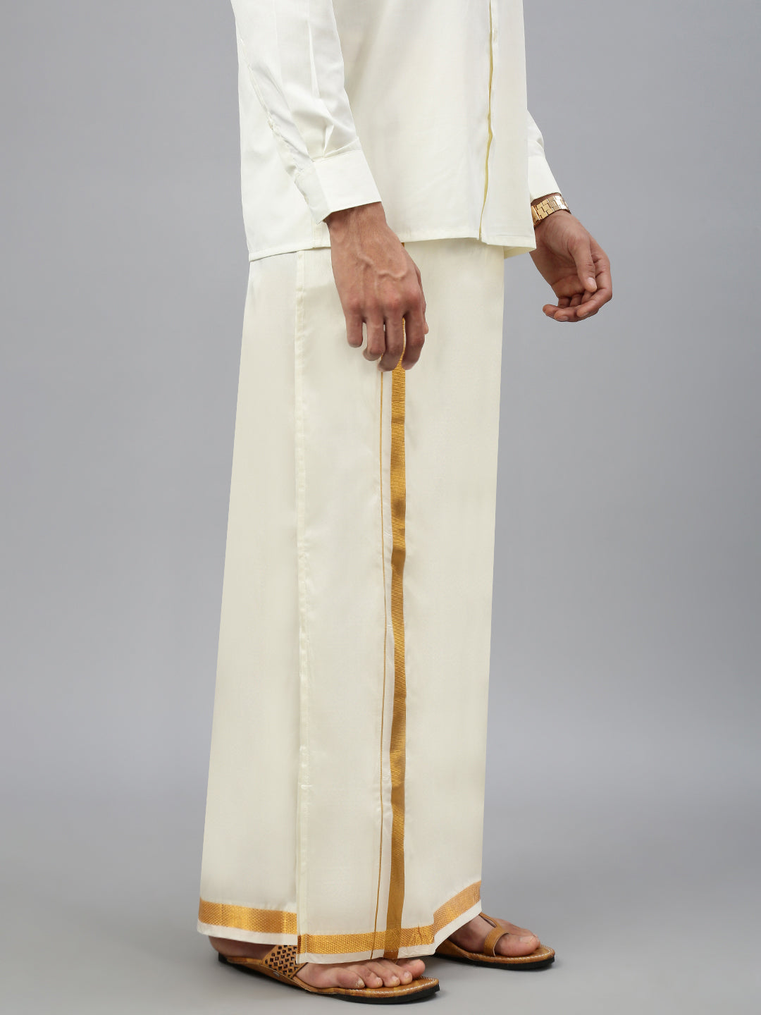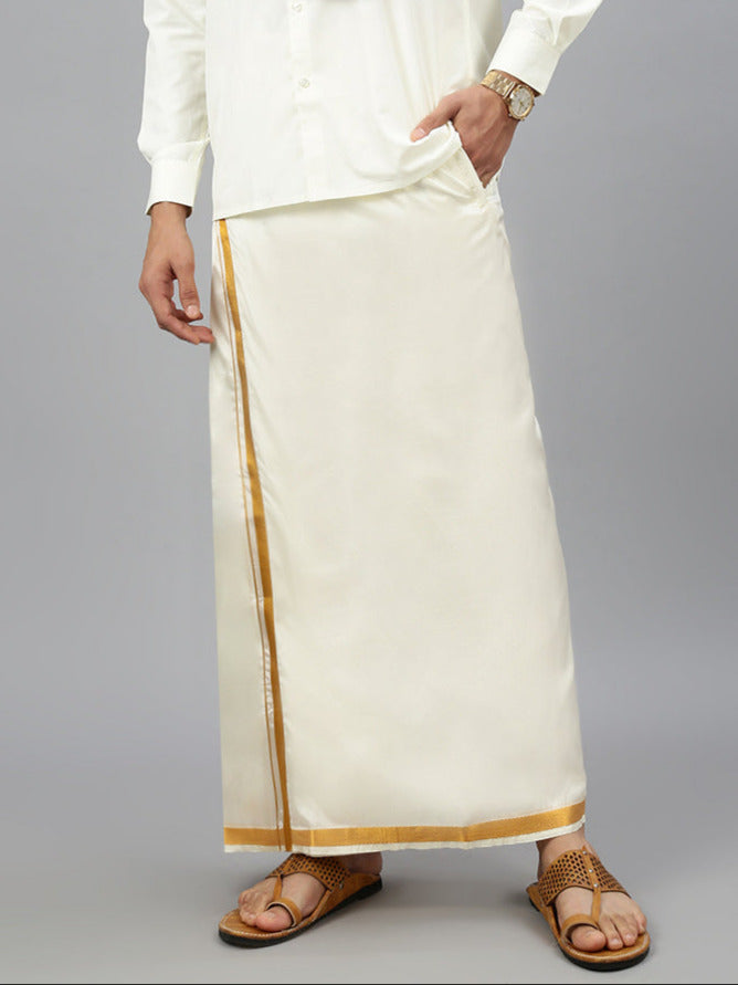 Men Art Silk Readymade Double Layer Cream Dhoti with Gold Jari Border