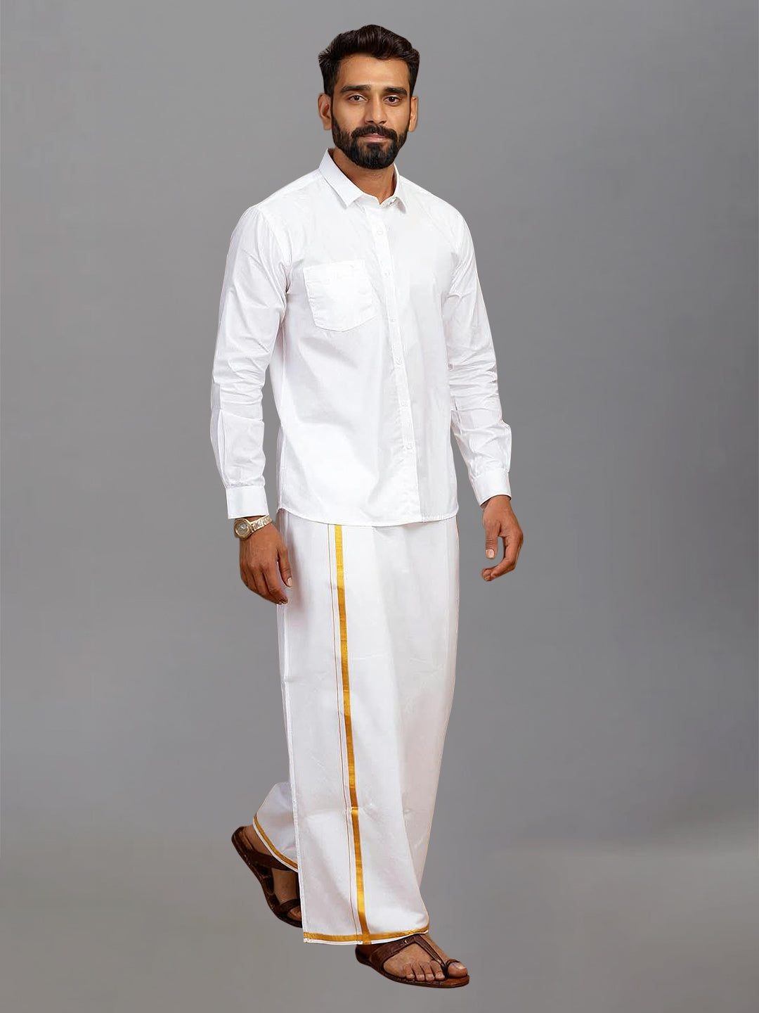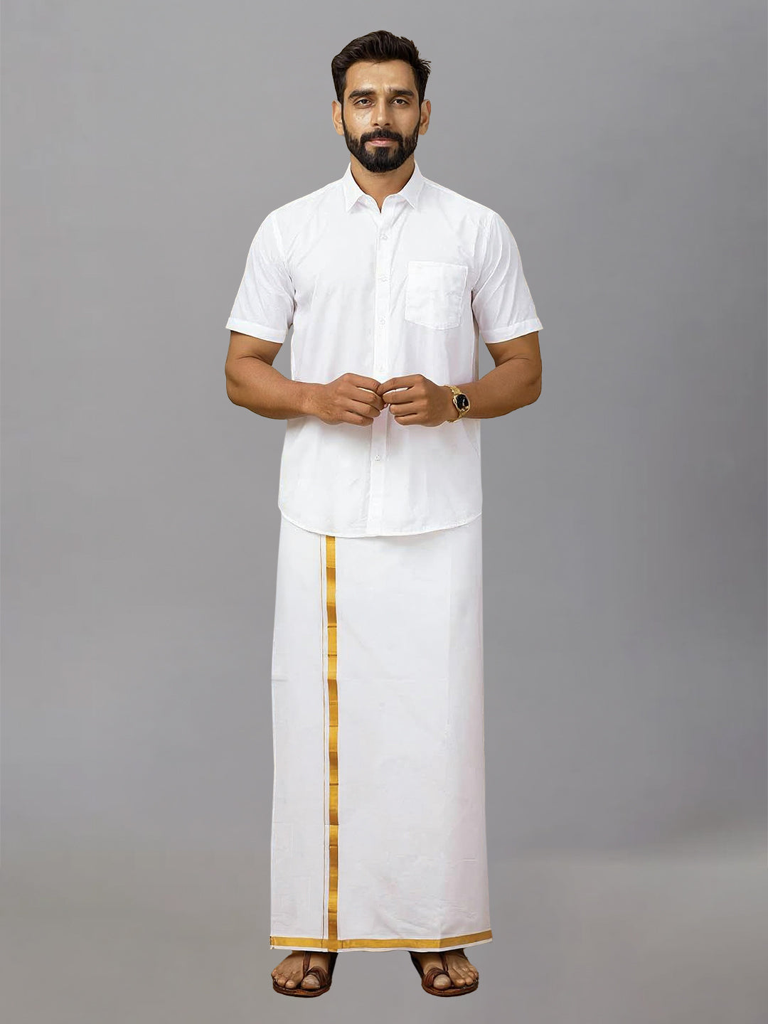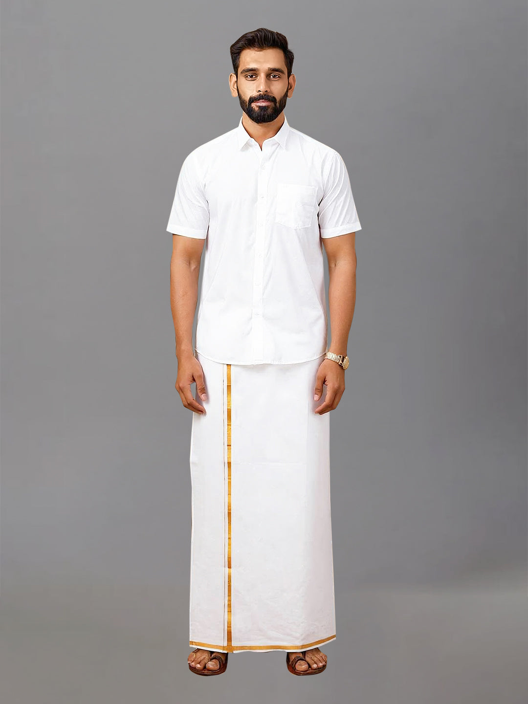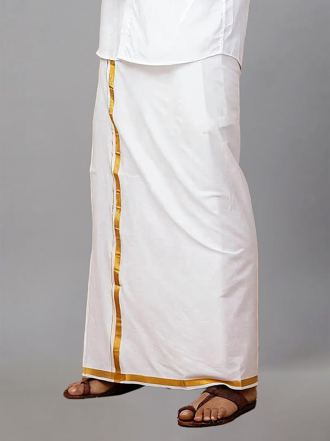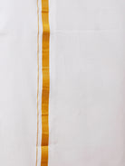 Step into timeless elegance with this classic White Shirt and Gold Jari Border Dhoti Set. Designed for traditional sophistication, the set features a crisp, white cotton shirt paired with a dhoti that boasts a shimmering gold zari border, adding just the right touch of festive flair. Perfect for religious ceremonies, weddings, or cultural celebrations, this ensemble offers both comfort and style, making it a must-have in your ethnic wardrobe.