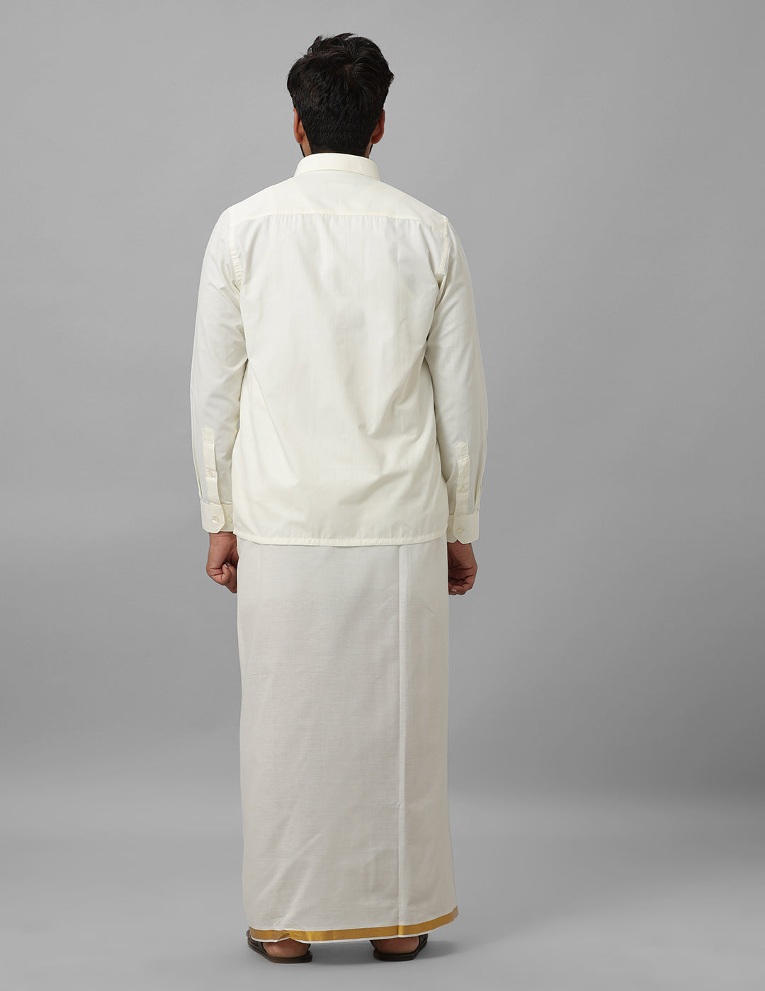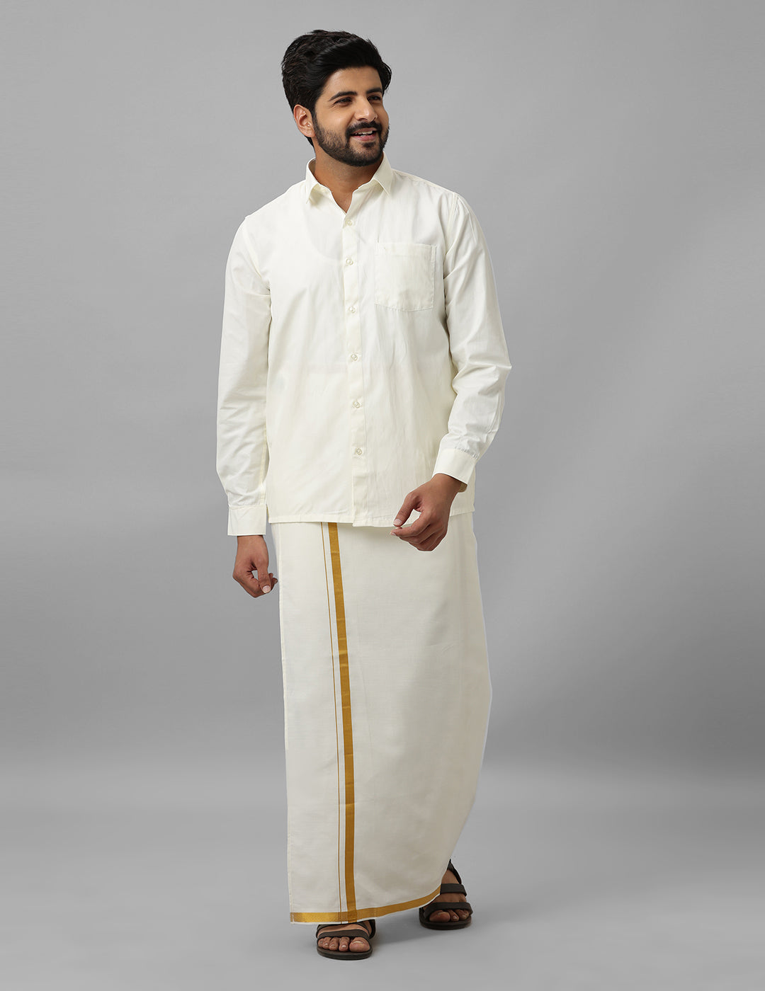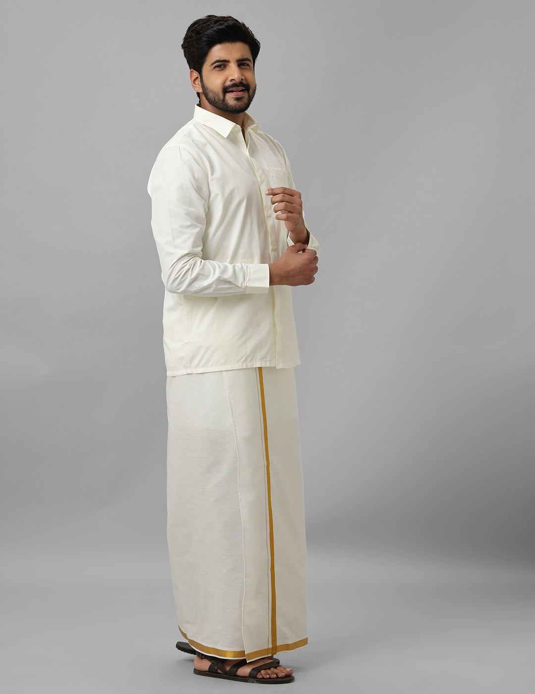 - Cream-colored dhoti with matching tone for a cohesive look