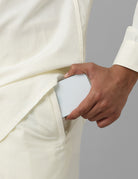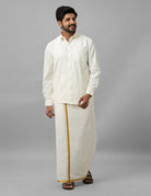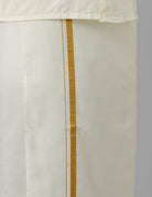 Men 100% Cotton Wedding Set Cream Shirt & Readymade Dhoti with Gold Jari Border