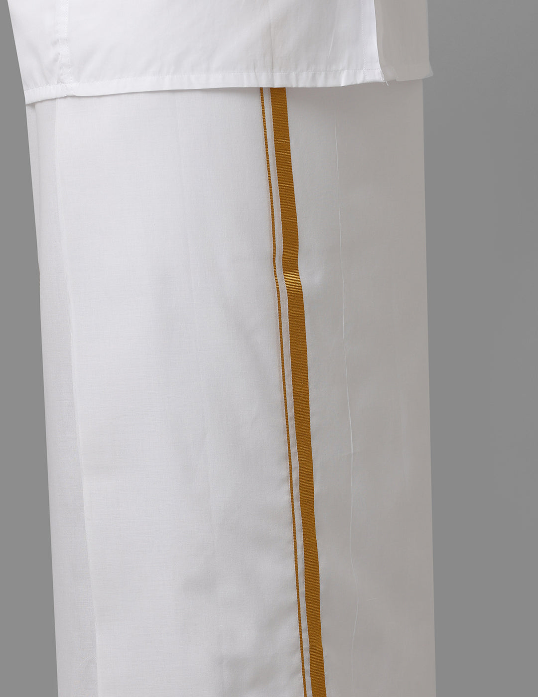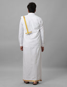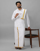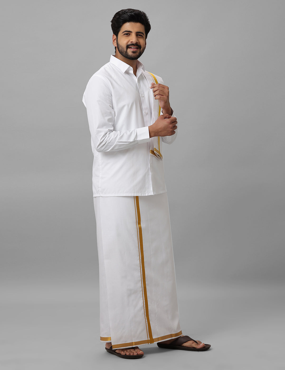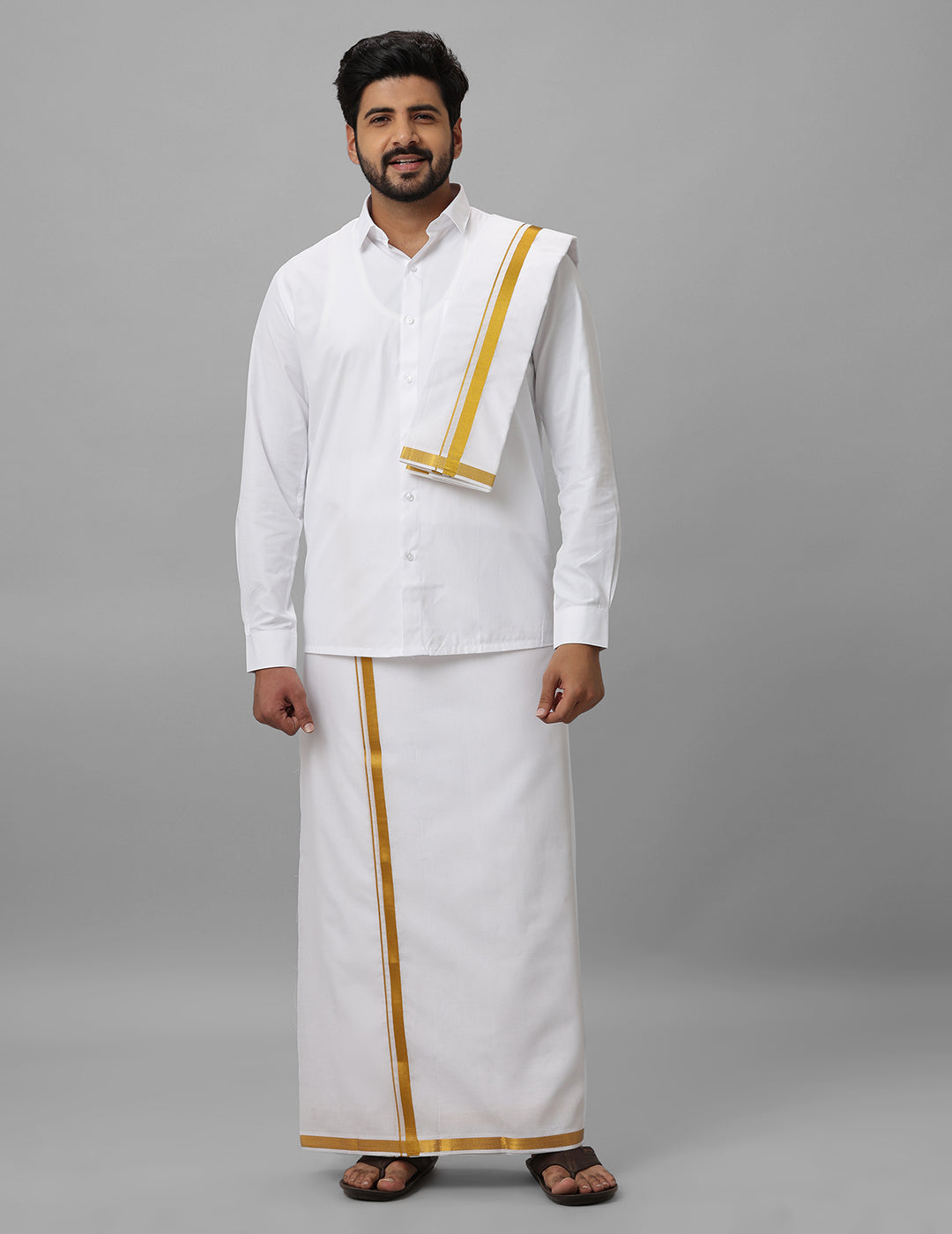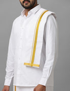 Men 100% Cotton Wedding Set White Shirt, Dhoti & Towel with Gold Jari Border