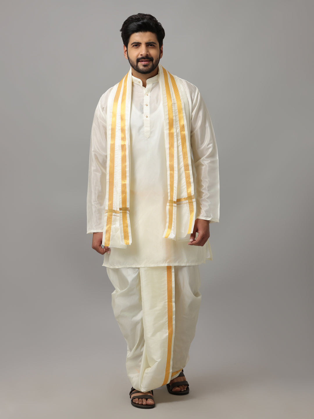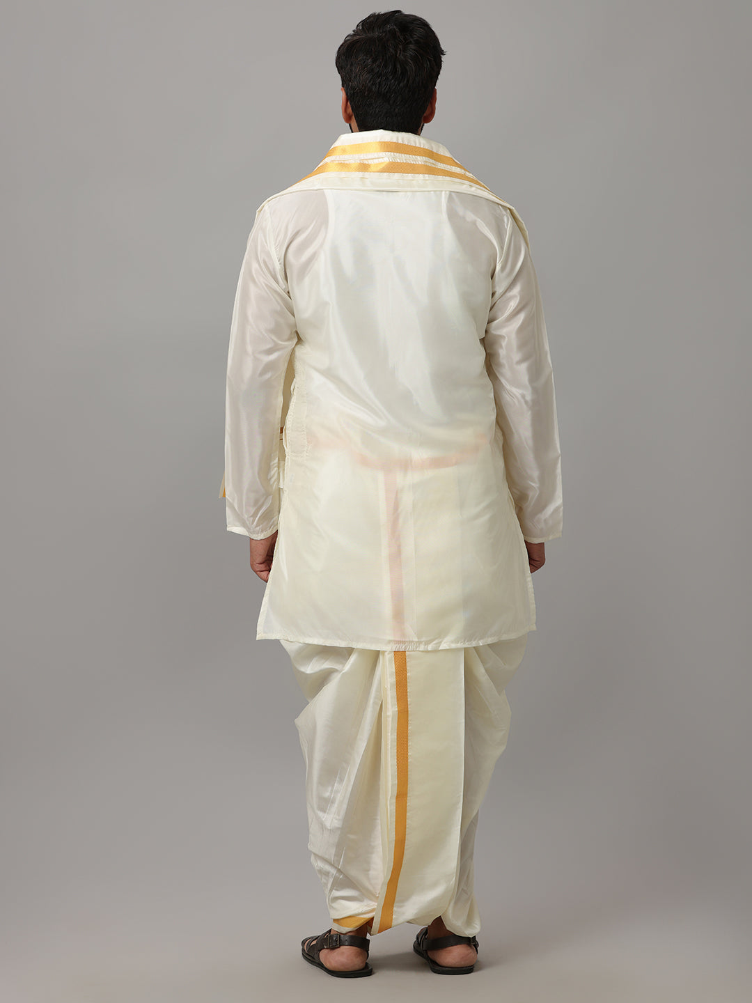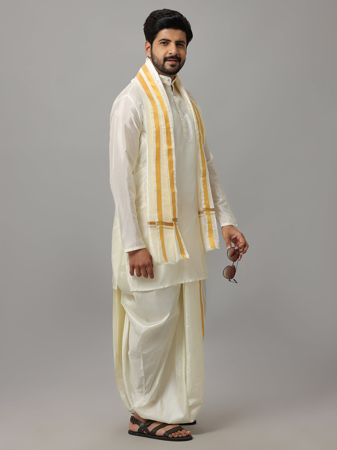 Men Art Silk Wedding Set Readymade Kurta, Panchakacham & Towel Set Cream
