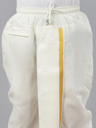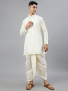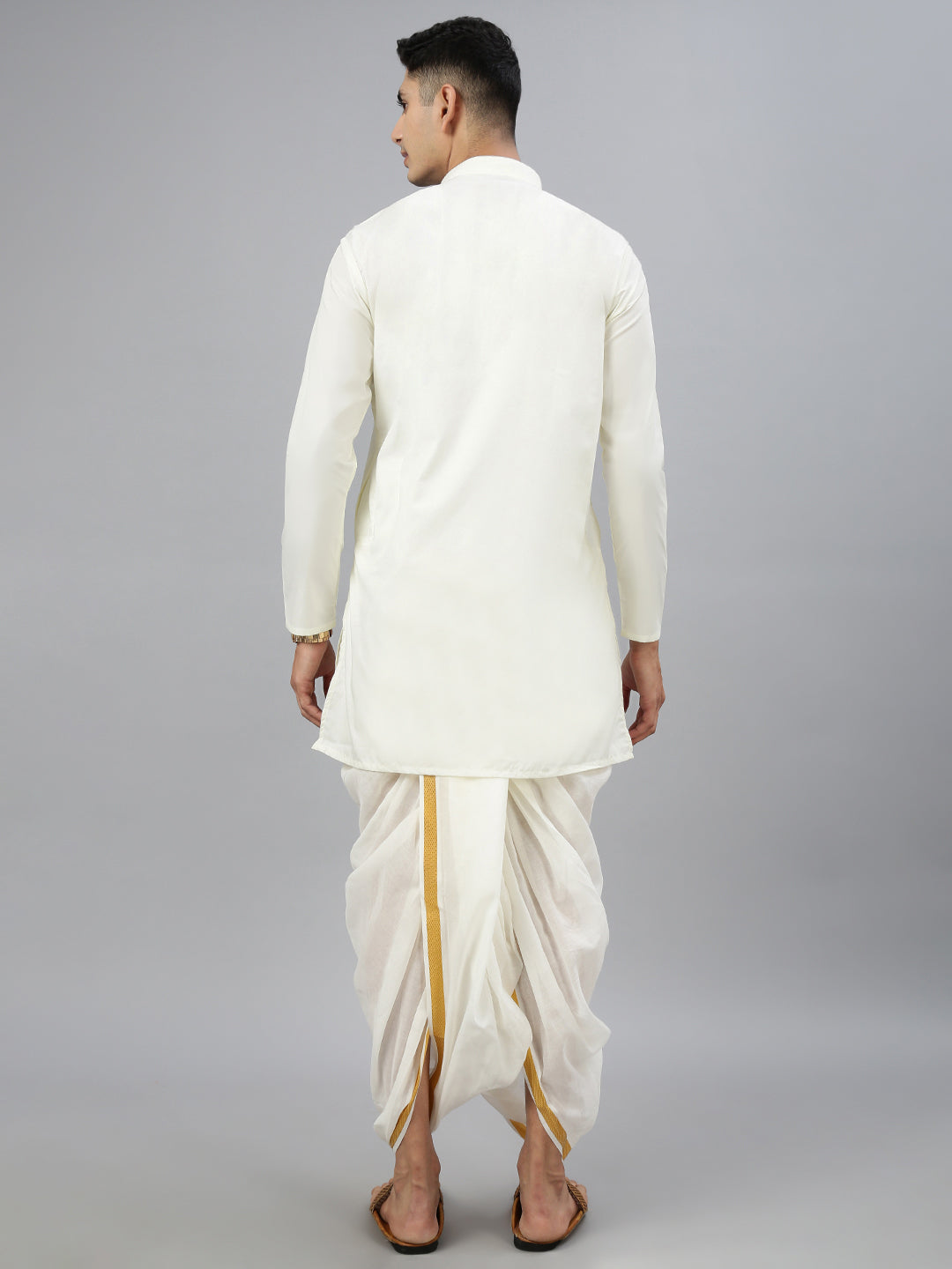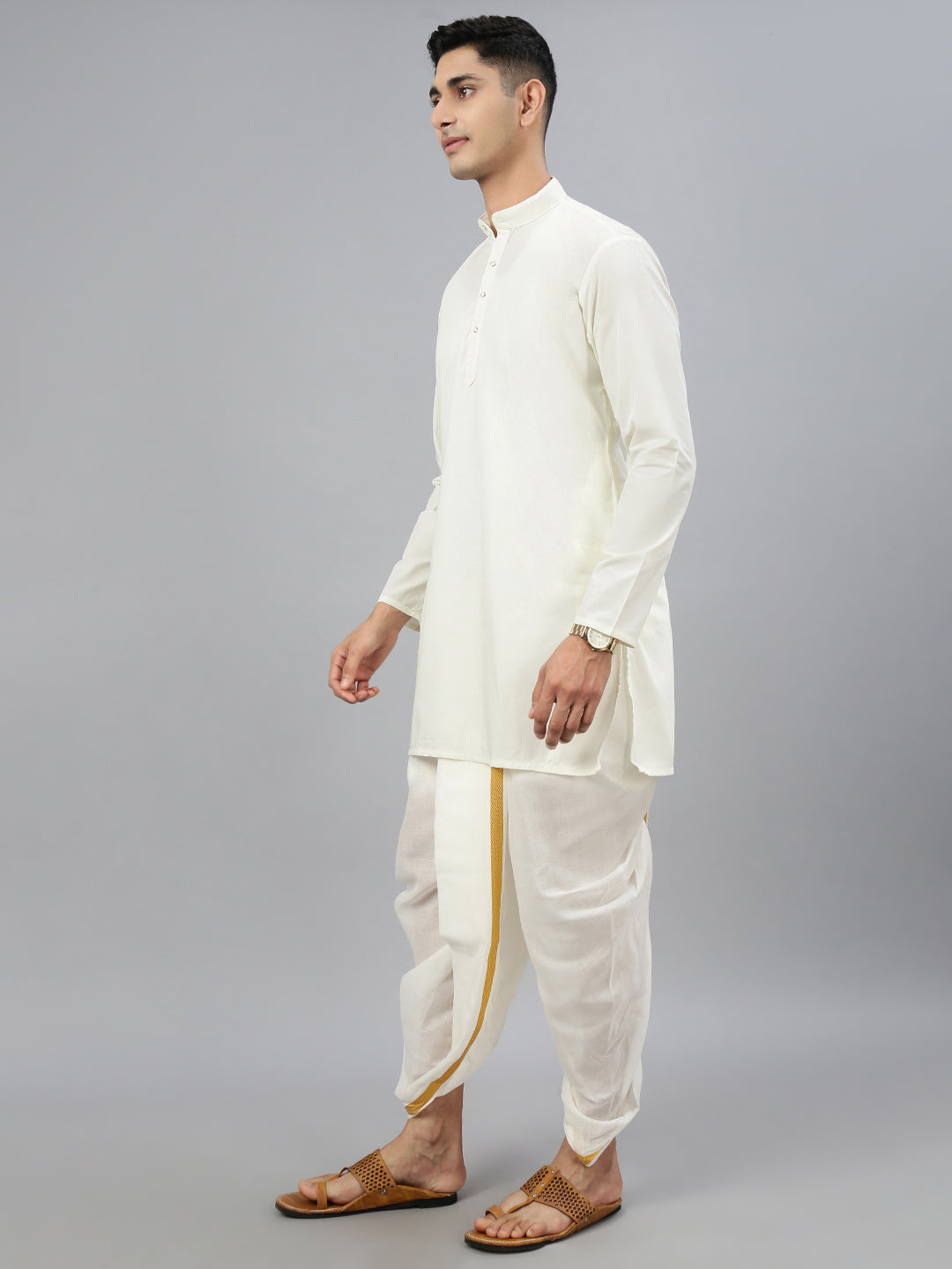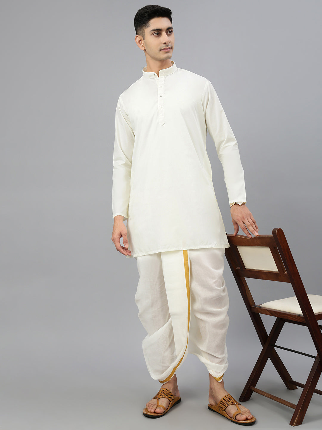 Men Cotton Cream Medium Length Plain Pocket Kurta with Panchakacham Set