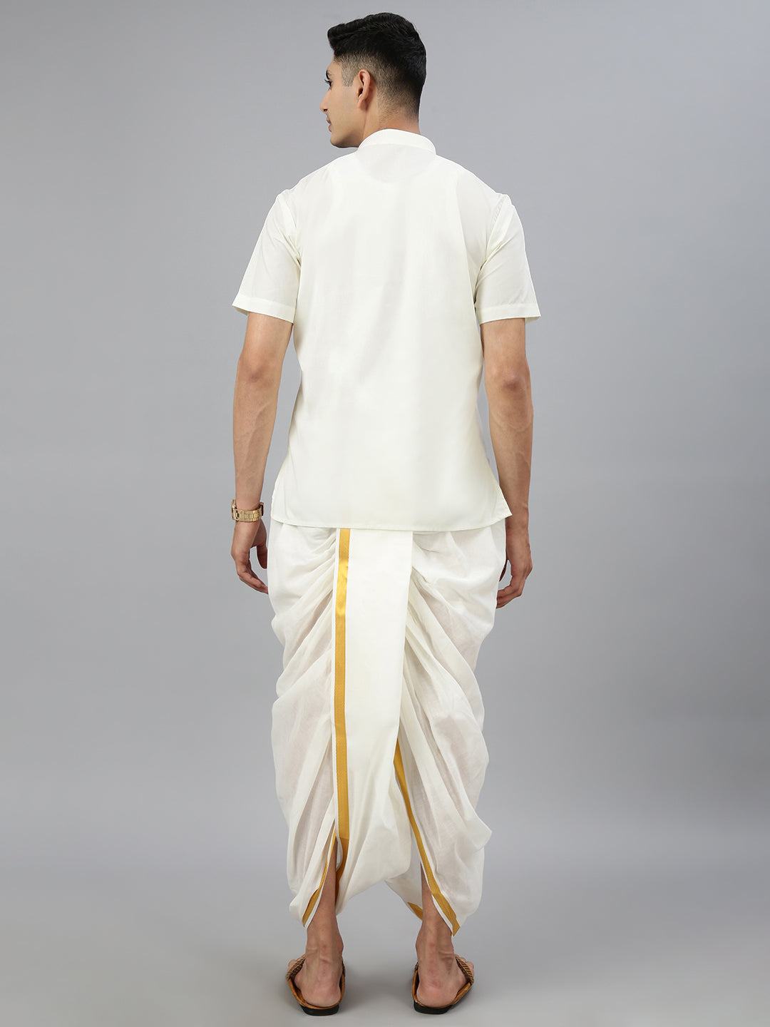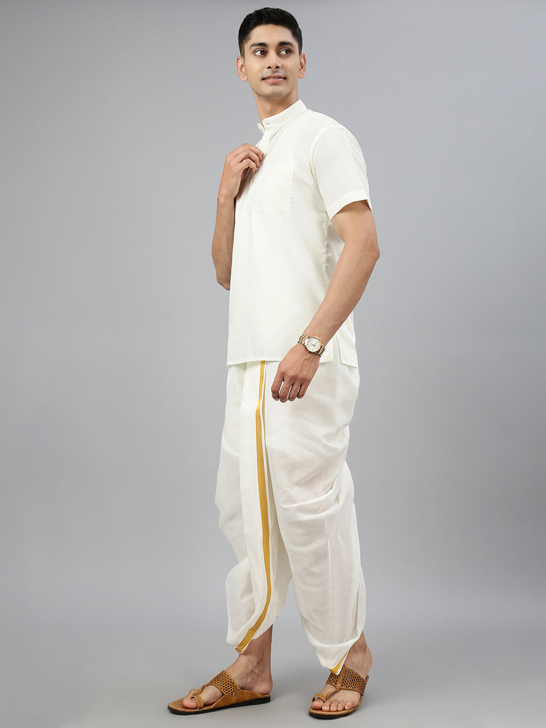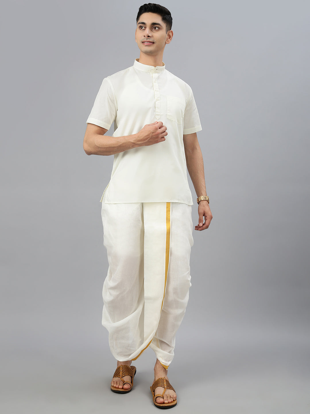 Men Cotton Cream Short Length Plain Pocket Kurta with Panchakacham Set